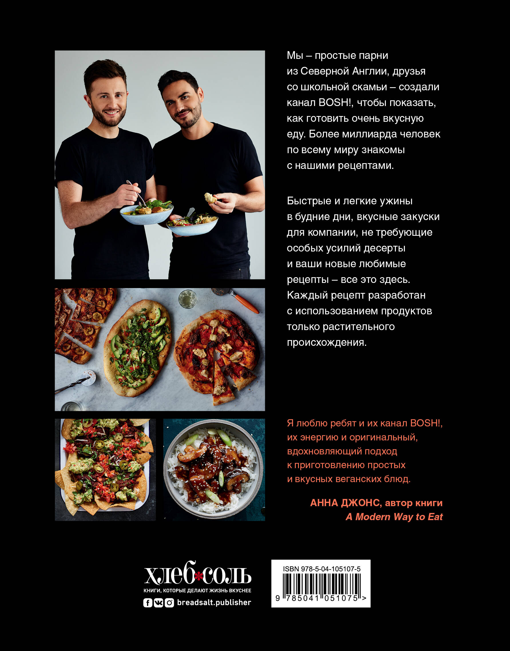 Еще три года назад им бы в голову не могла прийти мысль питаться только продуктами растительного происхождения. Тогда Иен и Генри были парочкой закадычных друзей из Шеффилда, которые ели мясо каждую неделю. Сегодня перед вами пара веганов, которые управляют bosh.tv - крупнейшим в мире онлайн-каналом, посвященным исключительно приготовлению растительной пищи. Что может быть лучше, чем убедить людей, что блюда из продуктов растительного происхождения могут быть вкусными? Что веганы - это не сумасшедшие, которые ради высокой идеи готовы отказаться от наслаждения едой, а обычные ребята, которые так же, как и все остальные, любят жизнь во всех ее проявлениях. У вас есть любимые рецепты, которые вы помните наизусть и используете снова и снова? Что ж, вас ждет их новое прочтение! Например, СЛИВОЧНАЯ КАРБОНАРА. В этом блюде все так, как надо: кремовая текстура, насыщенный вкус и сплошное наслаждение. Ароматные запеченные грибы прекрасно дополняют густой и сытный соус для пасты. Или ПИРОГ С ГРИБАМИ И ПИВОМ GUINNESS. О, боже мой, как же хороша авторская версия классики английских пабов - теплого сытного пирога! Это блюдо как будто сжимает вас в объятиях! Вкусу королевских шампиньонов, ароматных и аппетитных, пиво добавляет особые согревающие нотки. Идеально для зимнего вечера после продолжительной прогулки на морозе или тяжелого рабочего дня. Или НАШ ФИРМЕННЫЙ БУРГЕР. Иен и Генри очень любят хорошие бургеры, поэтому разработка рецепта такого блюда была одной из первоочередных задач. За богатый и насыщенный вкус бургера отвечают сладкий картофель, черные бобы и целая куча ароматных трав. «Мы хотели бы, чтобы вы взглянули и на сам процесс приготовления еды немного по-другому. Дело в том, что продукты животного происхождения вошли в рацион человека очень давно, поэтому мастерство их приготовления оттачивалось веками. А что касается растительной еды, то здесь дело редко шло дальше салатов и запеканок из овощей. Это означает только одно: мы имеем просто безграничные возможности для творчества в этом плане». Советы от авторов Готовьте обеды по-быстрому. Не жалейте времени на шедевры. Сделайте как надо. С первого раза. Это первоклассные рецепты. Готовьте блюда ресторанного уровня дома. Смотрите наши видеорецепты и делайте, как мы. Постоянно совершенствуйтесь, независимо от своего уровня. Имейте приличный запас фруктов и овощей - в свежем или замороженном виде. Содержите кухню в порядке - это упростит вам жизнь.| Издательство | ООО "Издательство "Эксмо" |