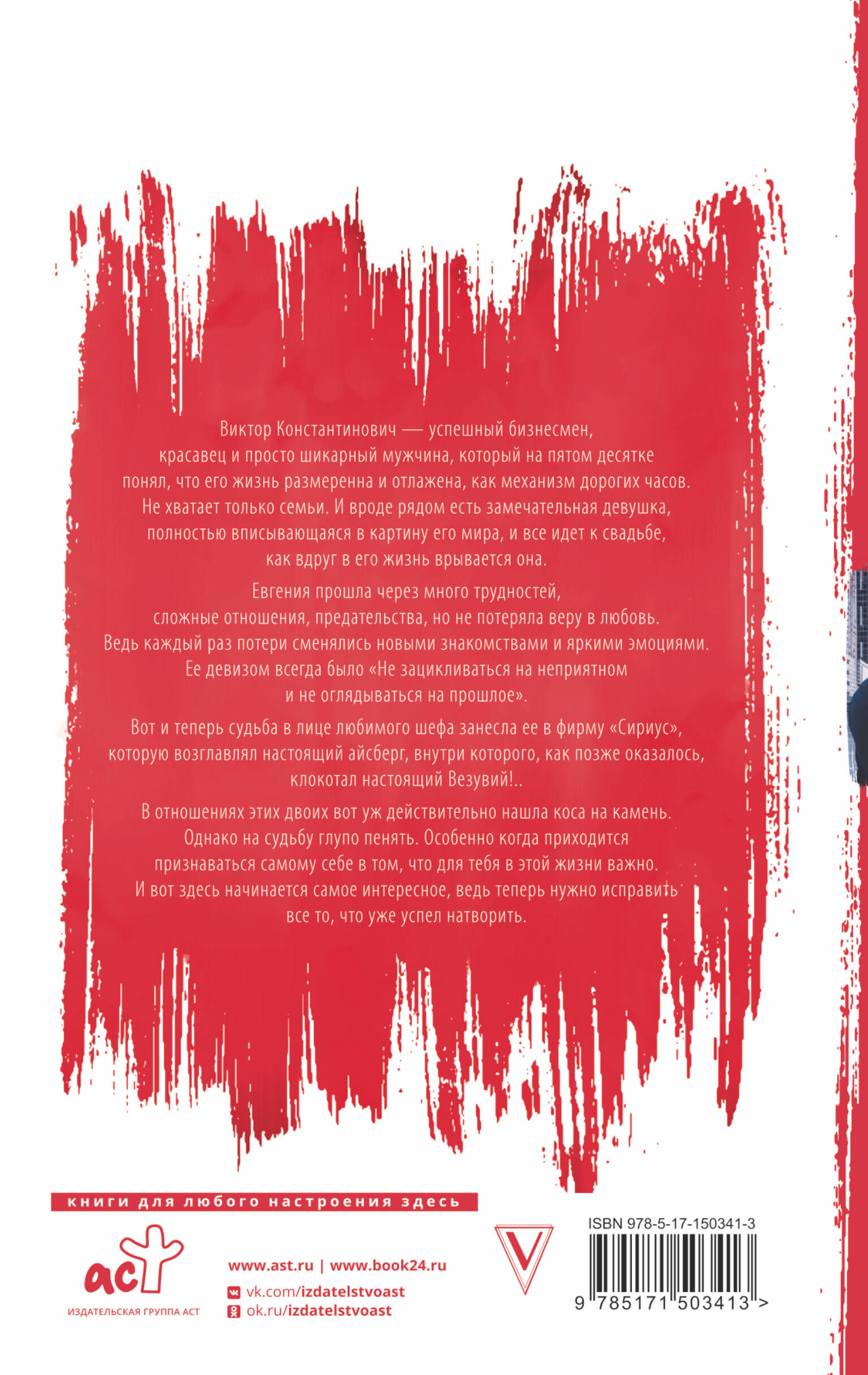 Виктор Константинович - успешный бизнесмен, красавец и просто шикарный мужчина, который на пятом десятке жизни понял, что его жизнь размерена и отлажена, как механизм дорогих часов. Не хватает только семьи. И вроде рядом есть замечательная девушка, полностью вписывающаяся в картину его мира и все идет к свадьбе, как вдруг в его жизнь врывается она. Евгения в своей жизни прошла через много трудностей, сложные отношения, предательства, но не потеряла веру в любовь. Ведь каждый раз потери сменялись новыми знакомствами и яркими эмоциями. Ее девизом всегда было "Не зацикливаться на неприятном и не оглядываться на прошлое". Вот и теперь, судьба, в лице любимого шефа, занесла ее в фирму "Сириус", которую возглавлял настоящий Айсберг, внутри которого, как позже оказалось, клокотал настоящий Везувий!.. В отношениях этих двоих, вот уж действительно, нашла коса на камень. Однако на судьбу глупо пенять. Особенно, когда приходится признаваться самому себе, в том, что для тебя в этой жизни важно. И вот здесь начинается самое интересное, ведь теперь нужно исправить все то, что уже успел натворить.| Издательство | АСТ |