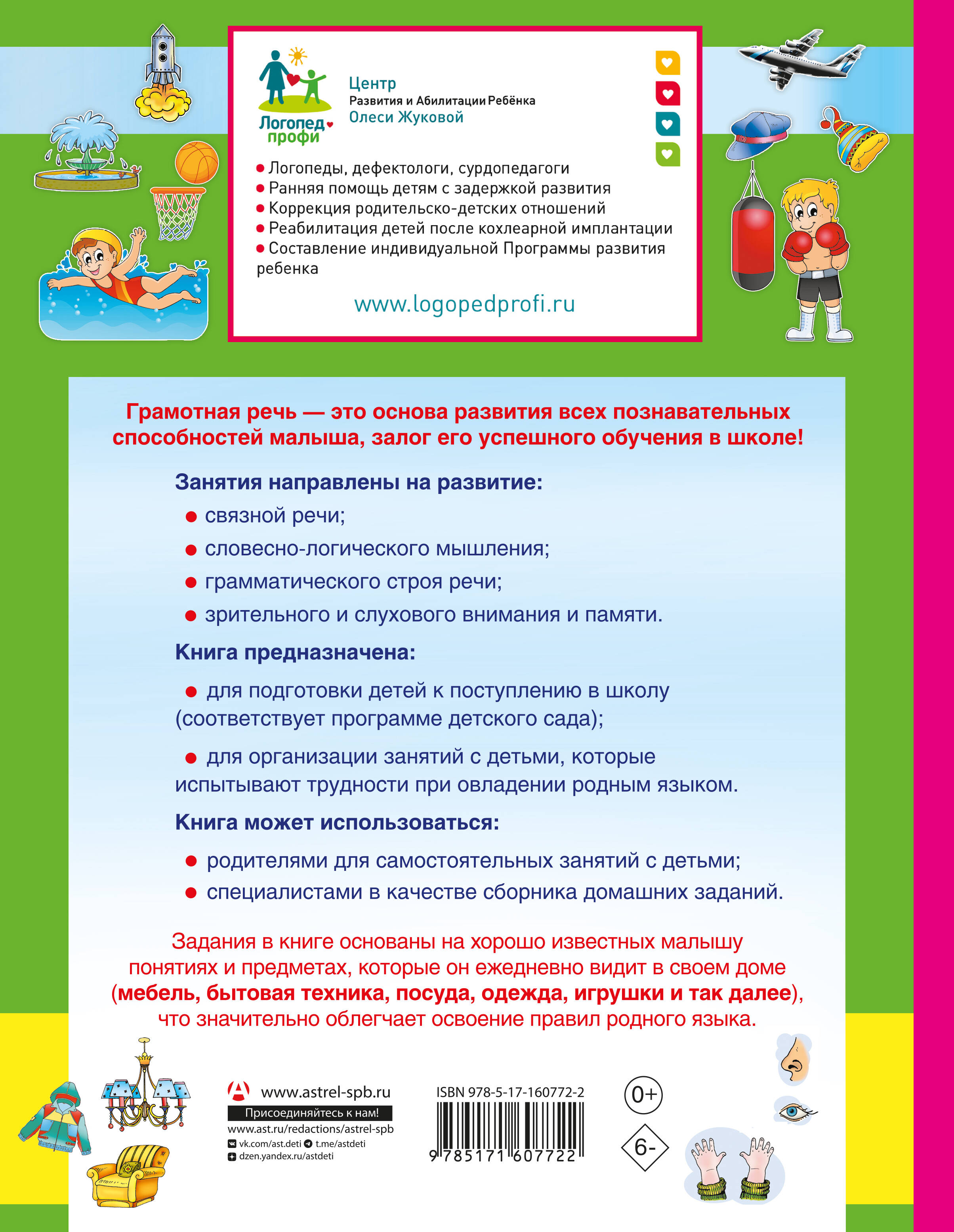Выполняя задания в этой книге, ребенок пополнит словарный запас, разовьет связную речь, словеснологическое мышление, зрительное и слуховое внимание, а также логику и воображение. Задания основаны на хорошо известных ребенку понятиях и предметах, которые он ежедневно видит в своем доме (мебель, бытовая техника, посуда, одежда, игрушки и так далее), что значительно облегчит малышу освоение грамматических правил родного языка. Для дошкольного возраста.| Издательство | Издательство "АСТ" |