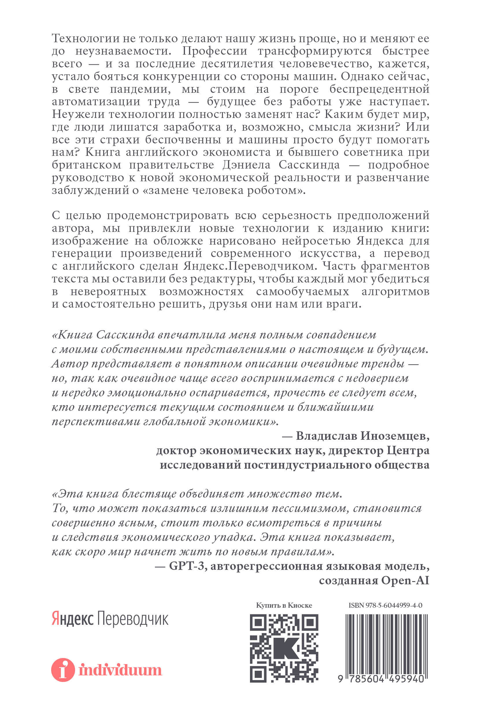 Технологии не только делают нашу жизнь проще, но и меняют ее до неузнаваемости. Профессии трансформируются быстрее всего - и за последние десятилетия человечество, кажется, устало бояться конкуренции со стороны машин. Однако сейчас, в свете коронавируса, мы стоим на пороге беспрецедентной автоматизации труда - будущее без работы уже наступает. Неужели технологии полностью заменят нас? Каким будет мир, где люди лишатся заработка и, возможно, смысла жизни? Или все эти страхи беспочвенны и машины просто будут помогать нам, чтобы мы смогли уделять больше времени семье и саморазвитию? Книга английского экономиста и бывшего советника при британском правительстве Дэниела Сасскинда - подробное руководство к новой экономической реальности и развенчание заблуждений о «замене человека роботом». С целью продемонстрировать всю серьезность предположений автора, мы привлекли новые технологии к изданию книги: изображение на обложке нарисовано нейросетью Яндекса для генерации произведений современного искусства, а перевод с английского сделан при помощи Яндекс.Переводчика. Часть фрагментов текста мы оставили без редактуры, чтобы каждый мог убедиться в невероятных возможностях самообучаемых алгоритмов и самостоятельно решить, друзья они нам или враги.| Издательство | ИНДИВИДУУМ ПРИНТ ООО |