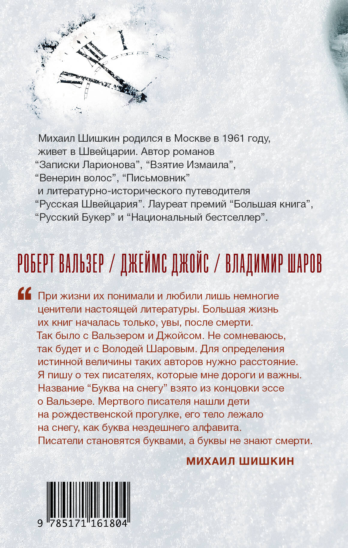 Михаил Шишкин родился в Москве в 1961 году, живет в Швейцарии. Автор романов "Записки Ларионова", "Взятие Измаила", "Венерин волос", "Письмовник" и литературно-исторического путеводителя "Русская Швейцария". Лауреат премий "Большая книга", "Русский Букер" и "Национальный бестселлер". "Роберт Вальзер, Джеймс Джойс, Владимир Шаров. При жизни их понимали и любили лишь немногие ценители настоящей литературы. Большая жизнь их книг началась только, увы, после смерти. Так было с Вальзером и Джойсом. Не сомневаюсь, так будет и с Володей Шаровым. Для определения истинной величины таких авторов нужно расстояние. Я пишу о тех писателях, которые мне дороги и важны. Название "Буква на снегу" взято из концовки эссе о Вальзере. Мертвого писателя нашли дети на рождественской прогулке, его тело лежало на снегу, как буква нездешнего алфавита. Писатели становятся буквами, а буквы не знают смерти". (Михаил Шишкин)| Издательство | ИЗДАТЕЛЬСТВО "АСТ" |