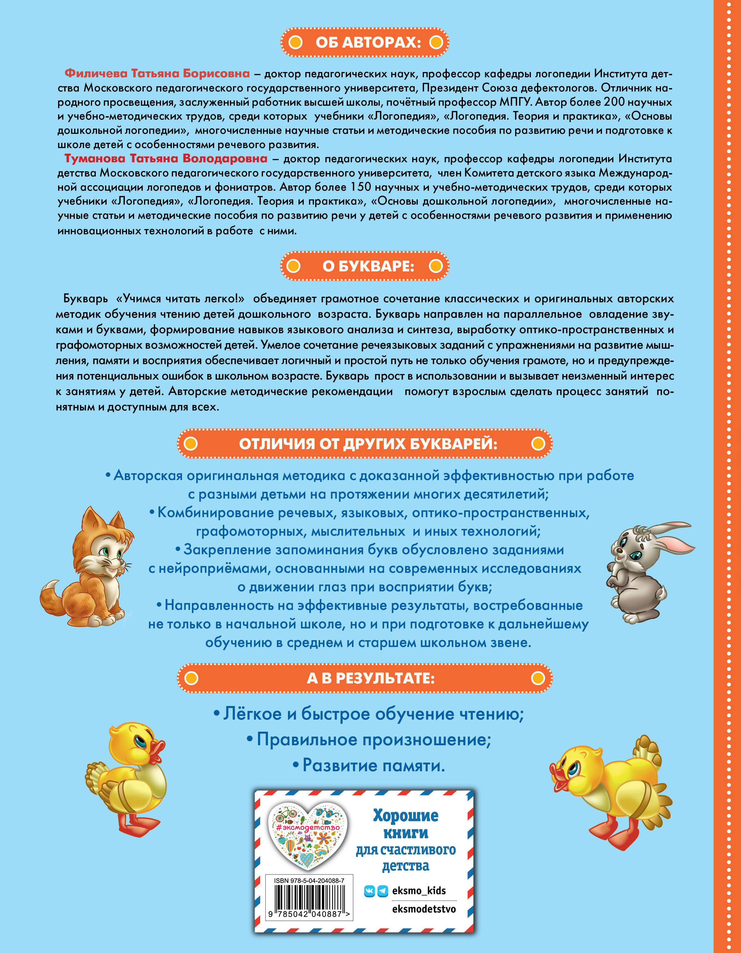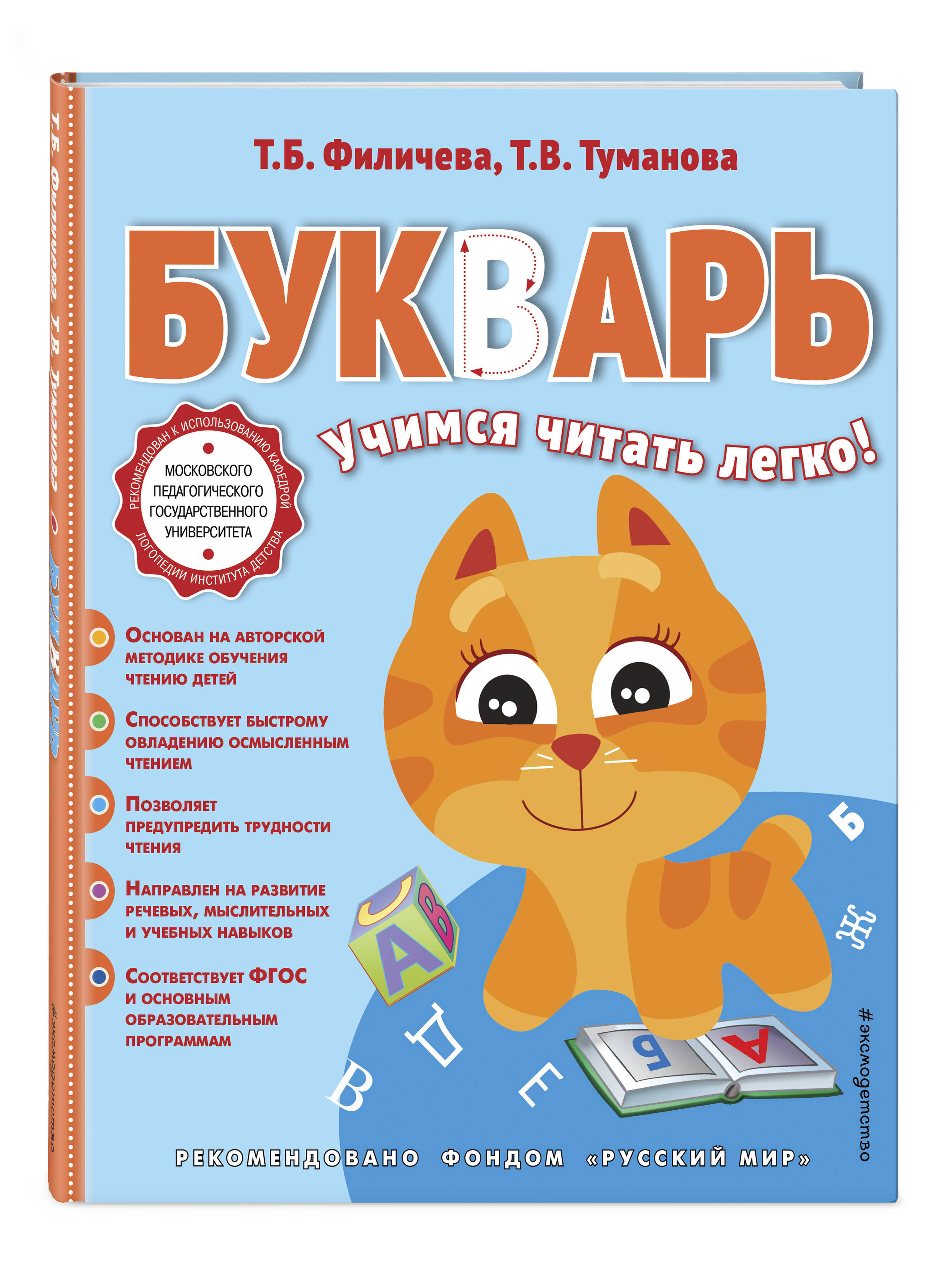 Об авторах: Филичева Татьяна Борисовна - доктор педагогических наук, профессор кафедры логопедии Института детства Московского педагогического государственного университета, Президент Союза дефектологов. Отличник народного просвещения, заслуженный работник высшей школы, почетный профессор МПГУ. Автор более 200 научных и учебно-методических трудов, среди которых учебники «Логопедия», «Логопедия. Теория и практика», «Основы дошкольной логопедии», многочисленные научные статьи и методические пособия по развитию речи и подготовке к школе детей с особенностями речевого развития. Туманова Татьяна Володаровна - доктор педагогических наук, профессор кафедры логопедии Института детства Московского педагогического государственного университета, член Комитета детского языка Международной ассоциации логопедов и фониатров. Автор более 150 научных и учебно-методических трудов, среди которых учебники «Логопедия», «Логопедия. Теория и практика», «Основы дошкольной логопедии», многочисленные научные статьи и методические пособия по развитию речи у детей с особенностями речевого развития и применению инновационных технологий в работе с ними. • Букварь соответствует ФГОС, основным образовательным и адаптированным программам. • Основан на авторской методике обучения чтению детей с особенностями речевого развития. • Способствует быстрому овладению осмысленным чтением. • Позволяет предупредить трудности чтения. • Направлен на развитие речевых, мыслительных и учебных навыков.| Издательство | ООО "Издательство "Эксмо" |
