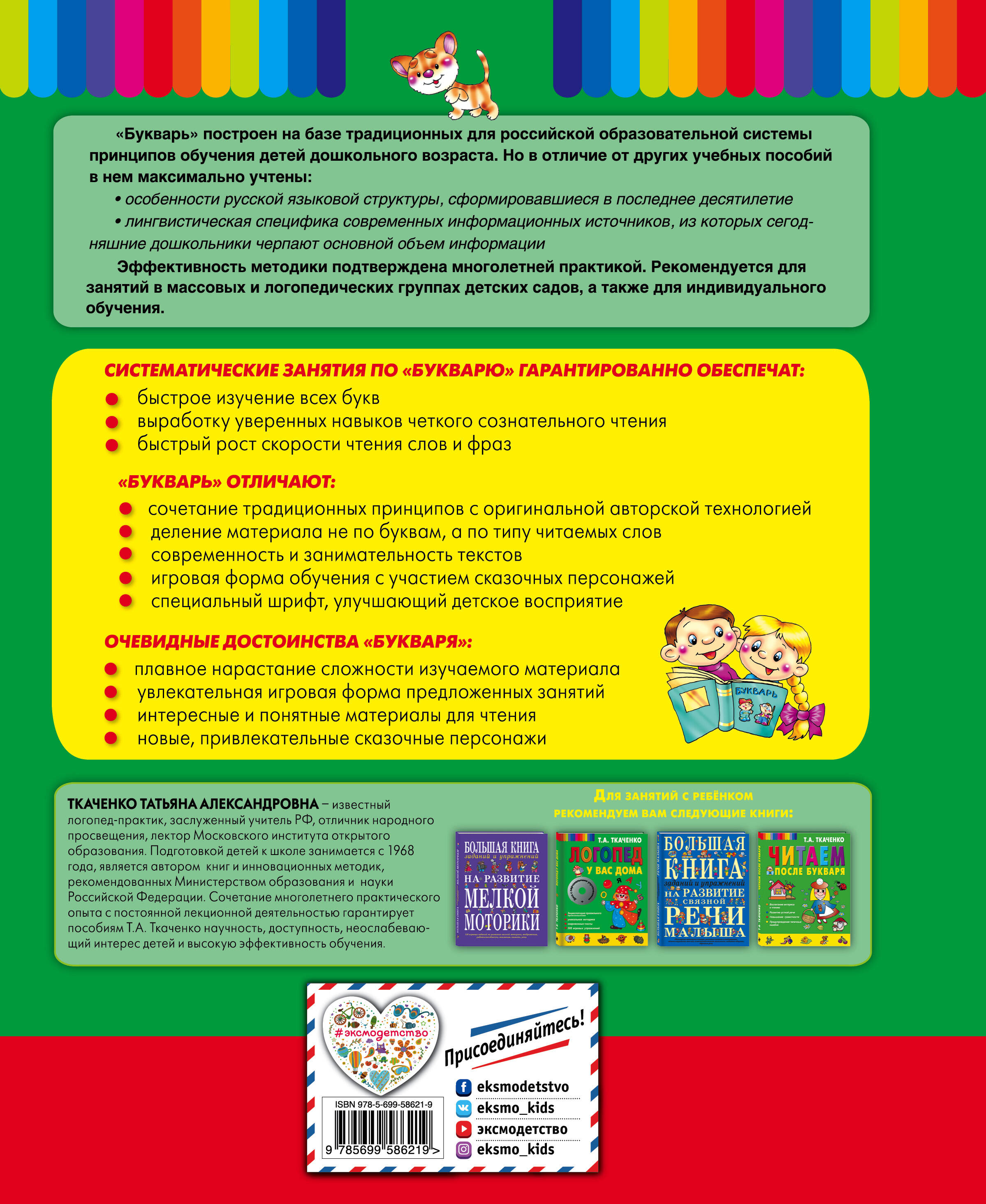 "Букварь" Ткаченко Т.А. представляет собой сборник заданий и текстов, позволяющих ребёнку овладеть чтением на уровне требований школы, а также избежать характерных ошибок. Особая система из 20 этапов обеспечивает плавное нарастание сложности, занимательность и высокую эффективность обучения, подтвержденную многолетней практической деятельностью. Наличие сказочных персонажей позволяет усваивать знания в игровой форме. Помимо рассказов, букварь содержит оригинальные тексты для чтения (весёлые стихи, "вместечиталки", загадки, трудноговорки, перепутанки, стихотворные правила, рифмовки-шутки и пр.). Букварь рассчитан на работу с детьми дома, в школах, гимназиях, массовых и логопедических группах детских садов, то есть универсален.