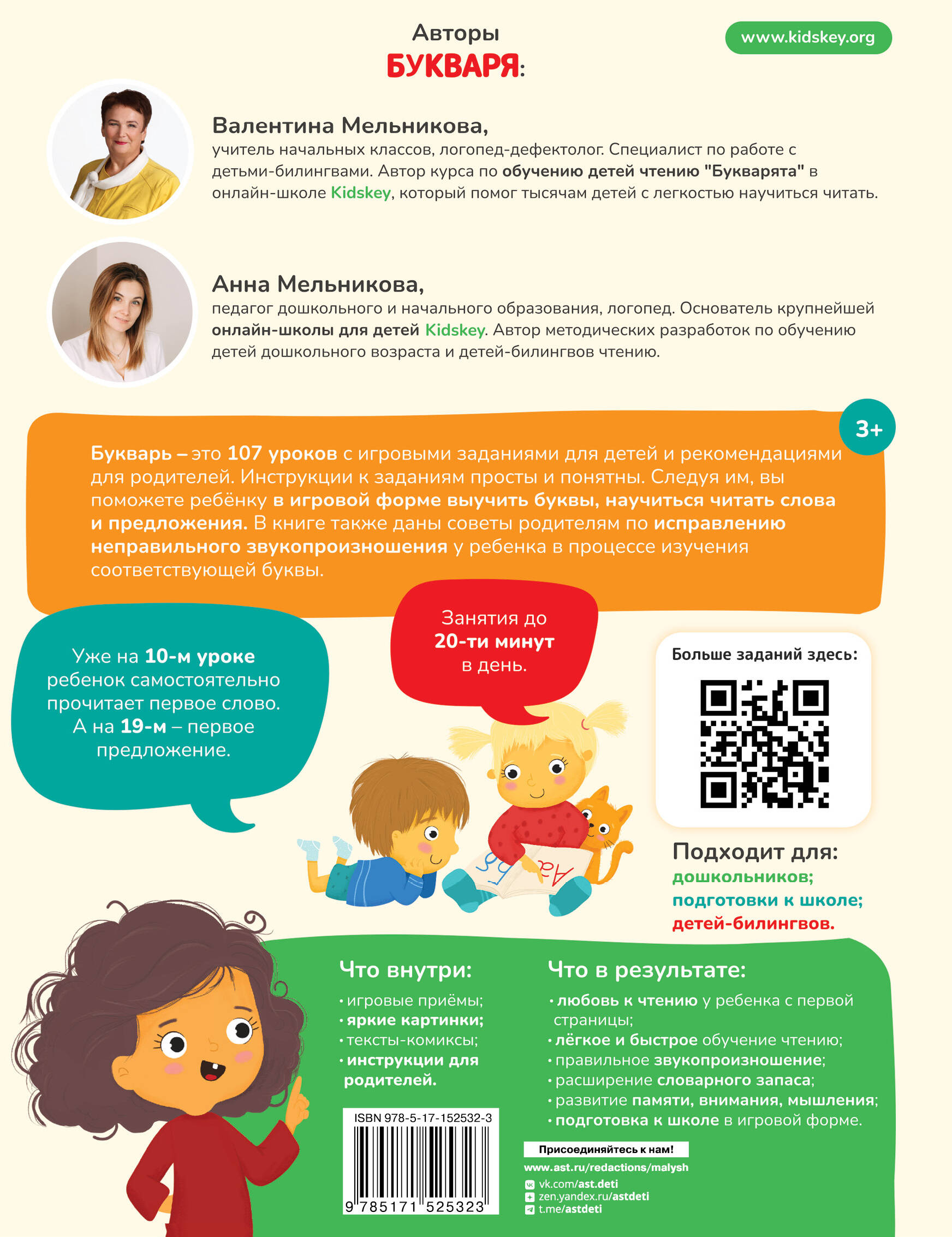 Этот букварь в комиксах - настоящая находка для малышей и их родителей! Уникальная методика обучения чтению от онлайн-школы Kidskey. Вас ждут 107 уроков с игровыми заданиями для детей и рекомендациями для родителей. Инструкции к заданиям просты и понятны. Следуя им, вы поможете ребенку в игровой форме выучить буквы, научиться читать слова и предложения. В книге также даны советы родителям по исправлению неправильного звукопроизношения в процессе изучения соответствующей буквы. - Занятия до 20 минут в день. - Уже на 10-м уроке ребенок самостоятельно прочитает первое слово, а на 19-м - первое предложение. - Подходит для дошкольников, подготовке к школе, детей-билингвов. Что внутри? - игровые приемы - яркие картинки - тексты-комиксы - инструкции для родителей Что в результате? - любовь к чтению с первой страницы - легкое и быстрое обучение чтению - правильное звукопроизношение - расширение словарного запаса - развитие памяти, внимания, мышления - подготовка к школе в игровой форме Авторы: Валентина Мельникова - учитель начальных классов, логопед-дефектолог. Специалист по работе с детьми-билингвами. Автор курса по обучению детей чтению "Букварята" в онлайн-школе Kidskey, который помог тысячам детей с легкостью научиться читать. Анна Мельникова - педагог дошкольного и начального образования, логопед. Основатель крупнейшей онлайн-школы для детей Kidskey. Автор методических разработок по обучению детей дошкольного возраста и детей-билингвов чтению. 3+ лет| Издательство | ИЗДАТЕЛЬСТВО "АСТ" |
