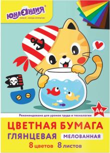 Бумага цветная. Юнландия. Котик Мяу, 8 листов, 8 цветов