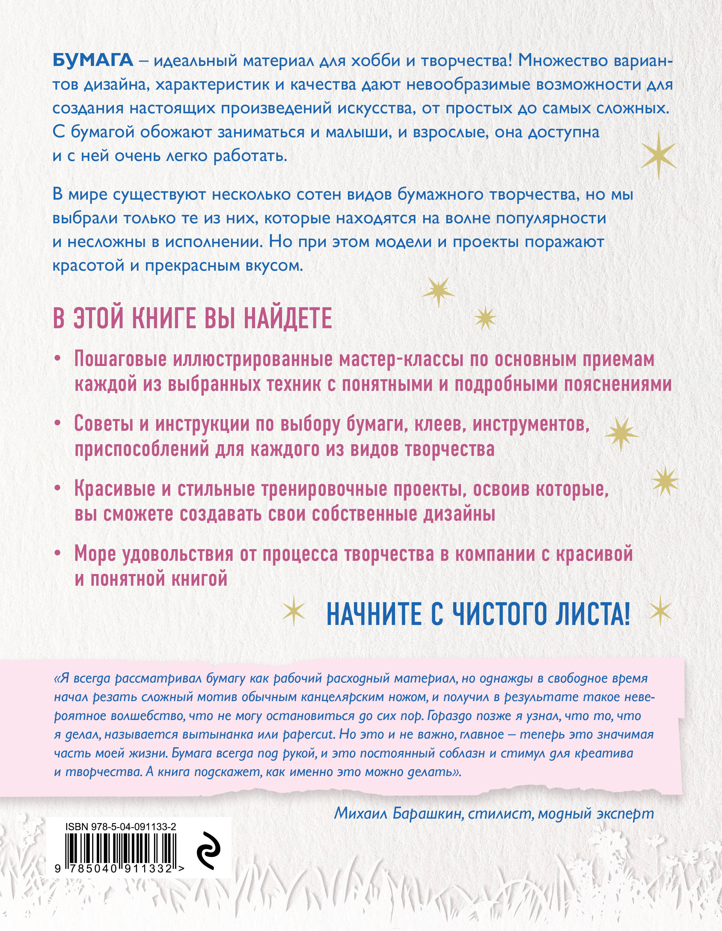 Вы удивитесь, сколько прекрасного можно сотворить из обыкновенной бумаги! Существуют сотни видов бумажного рукоделия, для этой книги мы выбрали только самые популярные и эффектные из них. Следуя инструкциям и пошаговым иллюстрациям, которых в книге более 1000, вы научитесь создавать настоящее волшебство в технике квиллинг или вытынанка, скрапбукинг или оригами, под вашими руками расцветут великолепные яркие цветы. Бумага - идеальный материал для творчества - она всегда под рукой и обладает невероятными возможностями. Освоив основы каждой из техник, вы сможете выбрать для себя только ваше хобби, которое останется с вами на всю жизнь.| Издательство | ООО "Издательство "Эксмо" |