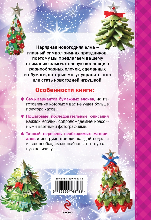 Представляем вниманию рукодельниц коллекцию оригинальных нарядных новогодних елочек, выполненных из бумаги. Каждое изделие сопровождается подробными пошаговыми описаниями, поясняющими фотографиями и нужными шаблонами в натуральную величину. Вам остается только запастись бумагой, ножницами и клеем и следовать инструкциям. Книга рассчитана на широкий круг читателей.