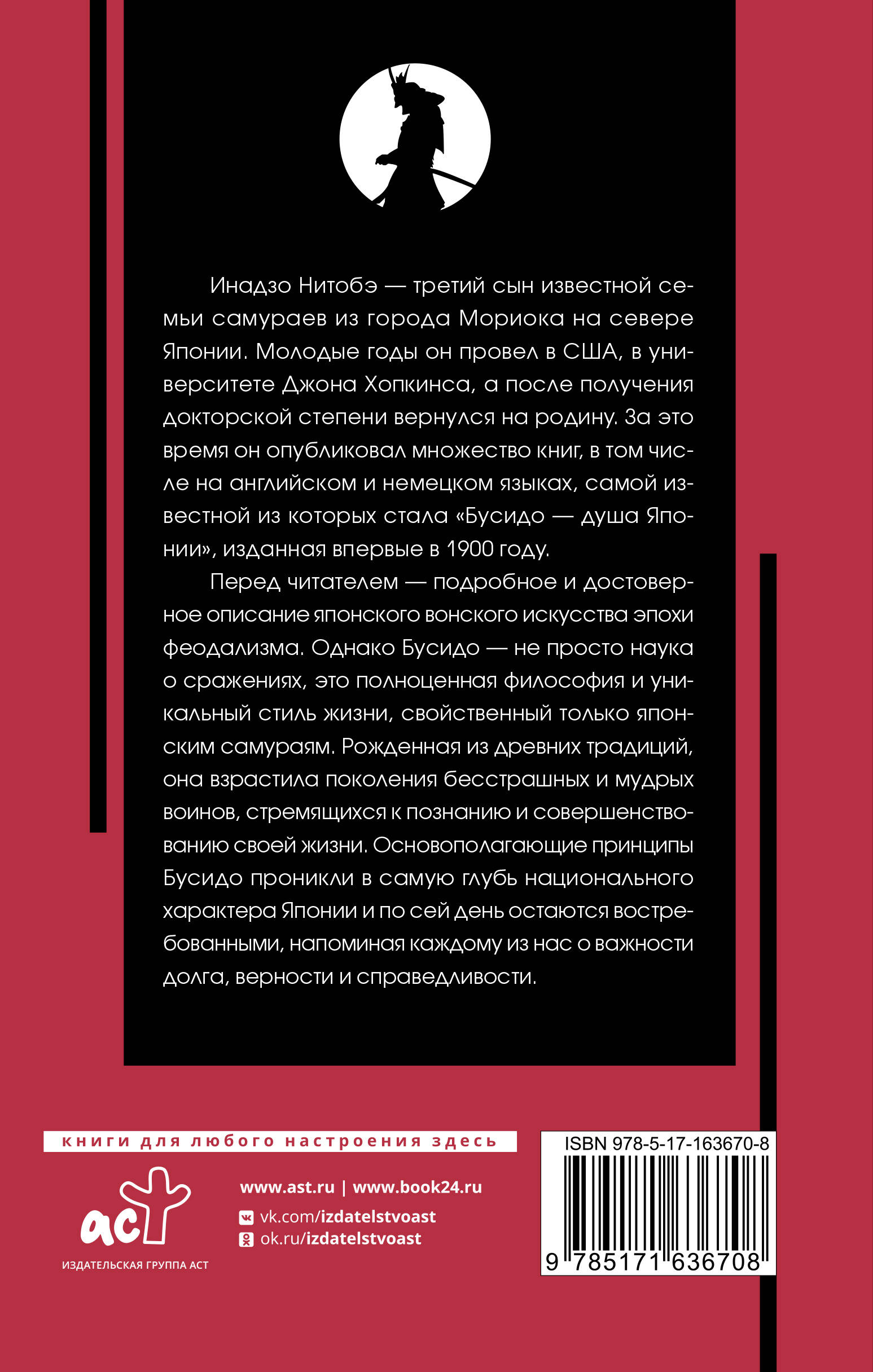 Инадзо Нитобэ - третий сын известной семьи самураев из города Мориока на севере Японии. Молодые годы он провел в США, в университете Джона Хопкинса, а после получения докторской степени вернулся на родину. За это время он опубликовал множество книг, в том числе на английском и немецком языках, самой известной из которых стала "Бусидо - душа Японии", изданная впервые в 1900 году. Перед читателем - подробное и достоверное описание японского вонского искусства эпохи феодализма. Однако Бусидо - не просто наука о сражениях, это полноценная философия и уникальный стиль жизни, свойственный только японским самураям. Рожденная из древних традиций, она взрастила поколения бесстрашных и мудрых воинов, стремящихся к познанию и совершенствованию своей жизни. Основополагающие принципы Бусидо проникли в самую глубь национального характера Японии и по сей день остаются востребованными, напоминая каждому из нас о важности долга, верности и справедливости.| Издательство | Издательство "АСТ" |