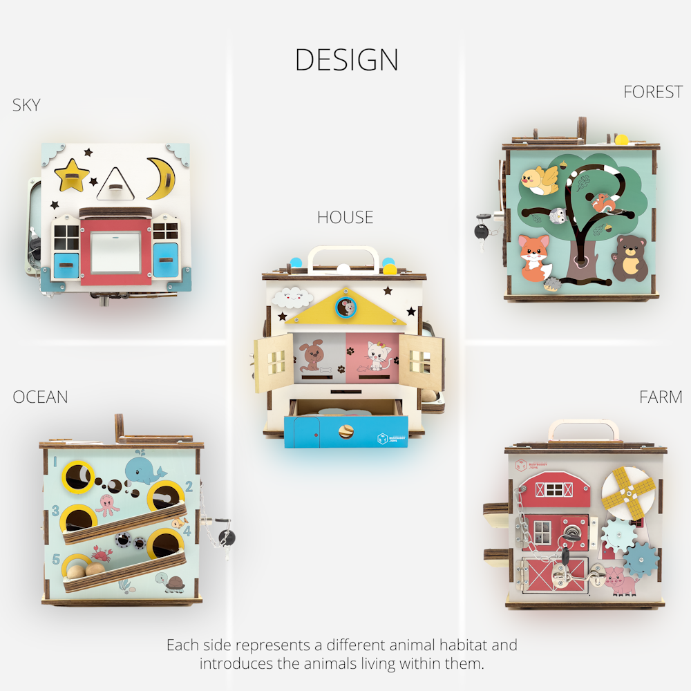 * 20-в-1 BUSY CUBE - мы продумали каждую деталь! Каждая сторона нашего Activity Cube представляет собой отдельную среду обитания животных - дом, ферму, лес, море и небо, и знакомит с животными, живущими в них. С технической стороны игрушка сделана так, чтобы поощрять детей и развивать их навыки, а также гарантировать безопасность. Кубик для активного отдыха увлекает юные умы и поощряет самостоятельные исследования.
