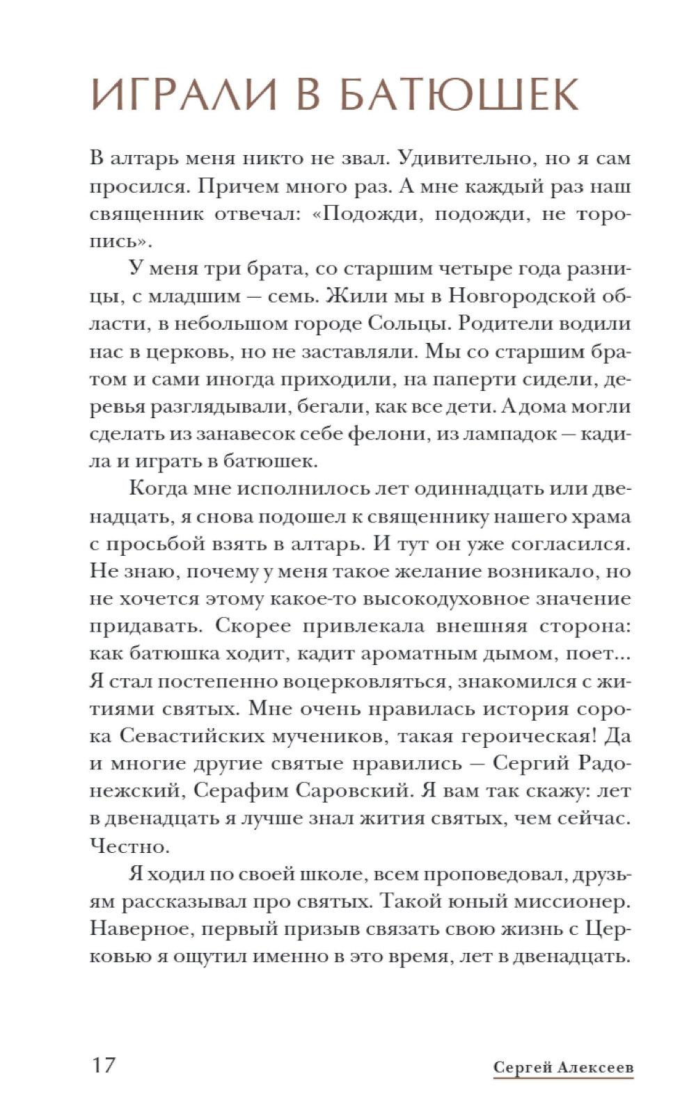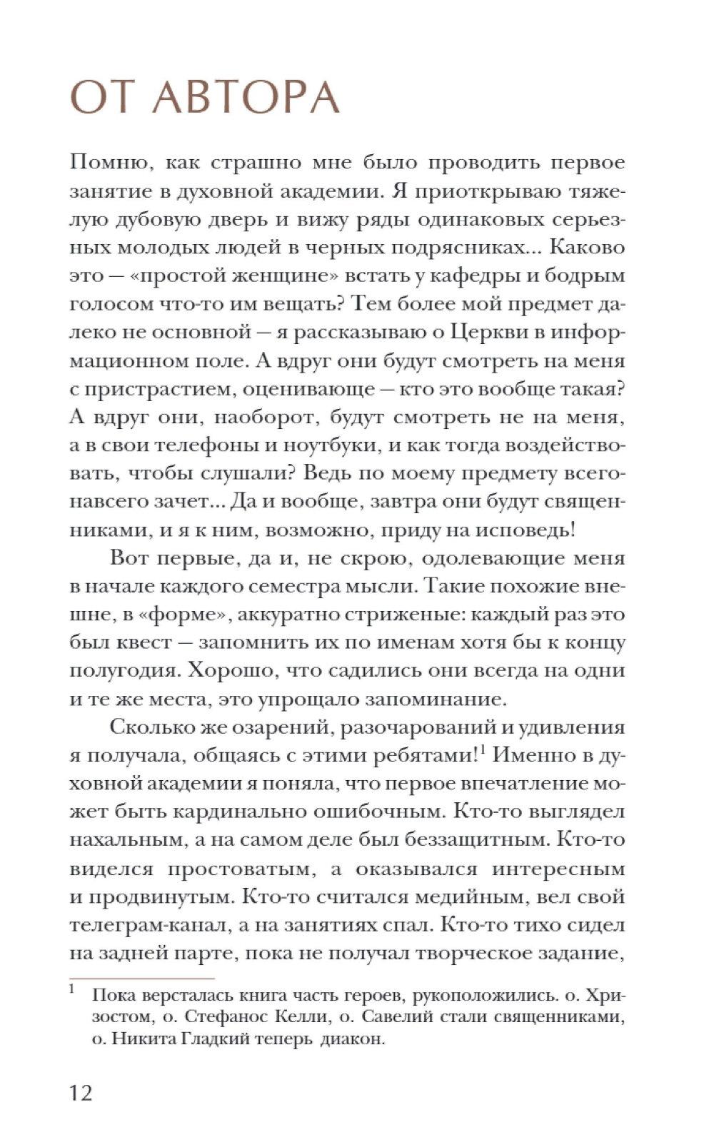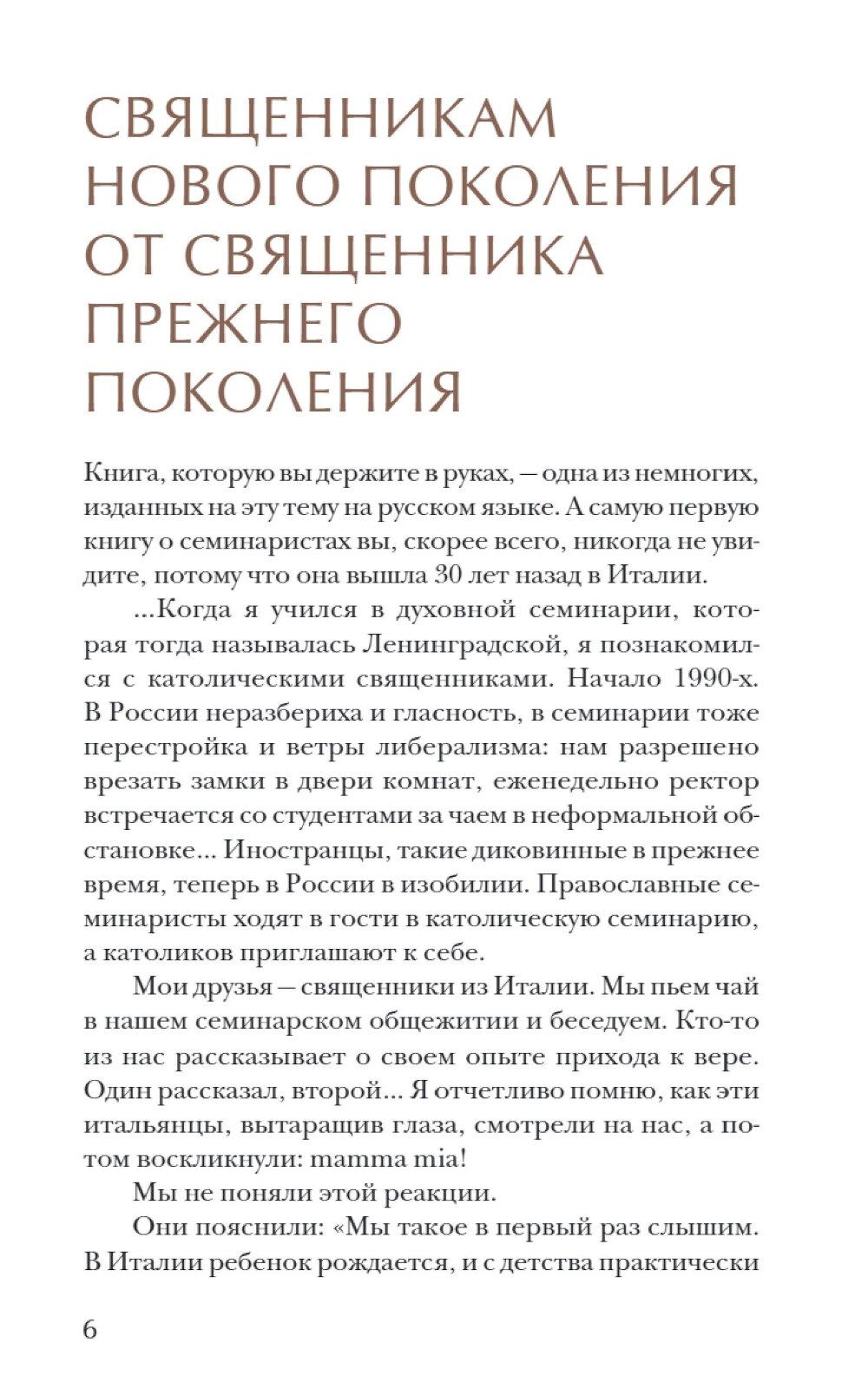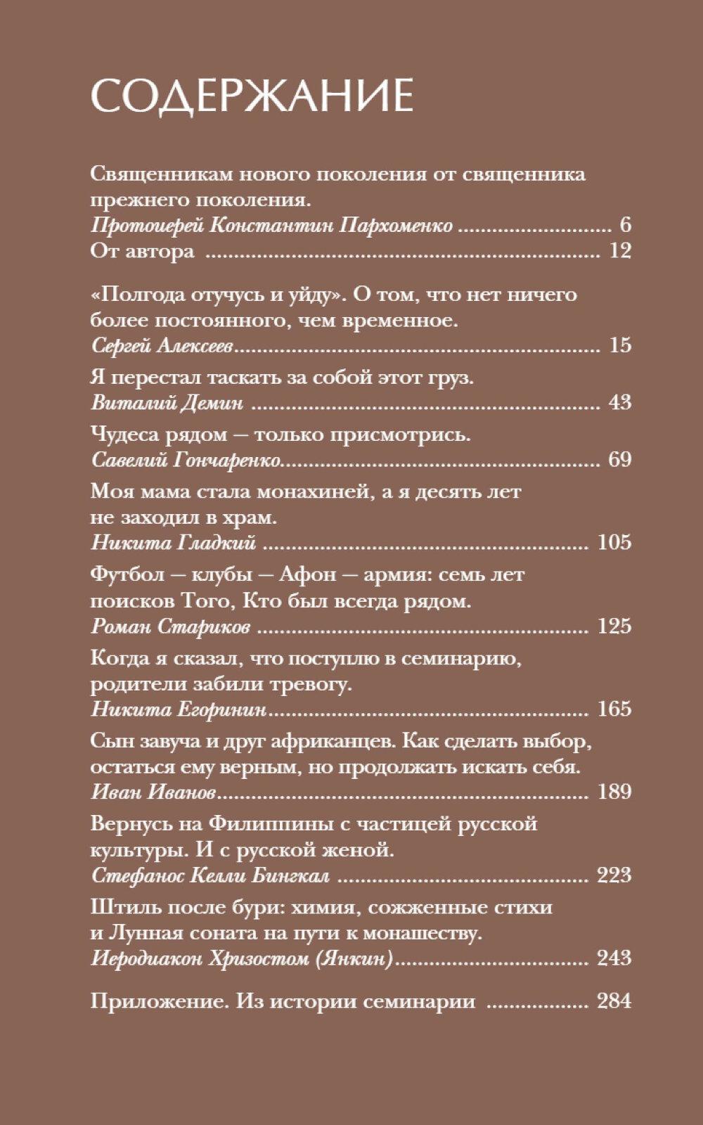 «Был футболистом, стал семинаристом. Непридуманные истории будущих священников» - одна из редких книг, посвященных «закулисью» жизни в духовной семинарии. Девять героев рассказывают о поисках Бога, делятся историями сложного духовного выбора и последующего изменения судьбы. Возможно, у кого-то из них жизнь до принятия священства была ярче и благополучнее, но тем серьезнее и ответственнее воспринимается их решение. Ведь путь будущего священника всегда требует твердой веры, большой силы воли и терпения.| Издательство | Изд. НИКЕЯ |