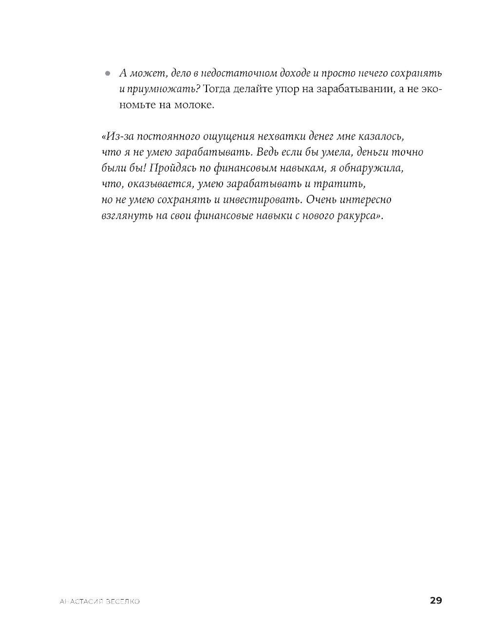 Деньги утекают сквозь пальцы, зарплата заканчивается раньше месяца, а от одного взгляда на банковскую выписку становится тошно. Знакомо? Вы не одиноки - миллионы людей живут в финансовом хаосе, несмотря на горы прочитанных книг и скачанных приложений по личным финансам. Дело вовсе не в отсутствии финансовых знаний или недостатке дисциплины. Проблема глубже: стандартные рекомендации не учитывают, что мы - люди, живые, со своими страхами, привычками и внутренними противоречиями. Анастасия Веселко, эксперт по личным финансам, написала книгу не о формулах и таблицах, а о настоящих причинах, которые мешают нам управлять своими деньгами. Почему мы боимся смотреть в банковскую выписку? Откуда берется стыд за траты? Почему мы действуем себе во вред, даже когда знаем, как нужно поступать? Это честный разговор о деньгах как о части жизни - со всеми сложностями и противоречиями. Вместо недостижимых идеалов - поддержка, принятие и реальные шаги, которые помогут выйти из хаоса к устойчивой, спокойной финансовой системе.