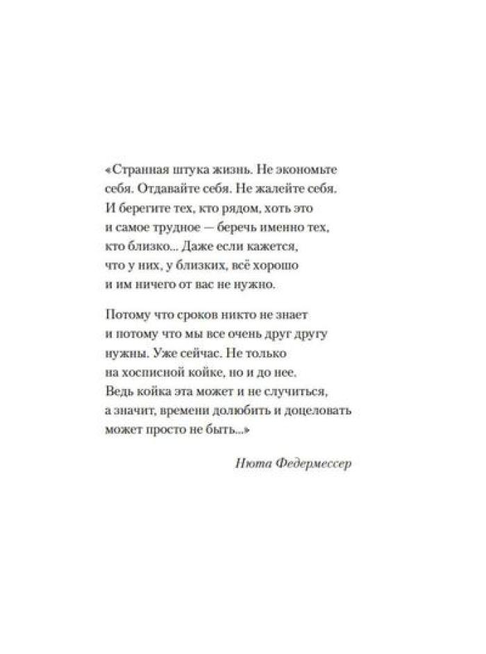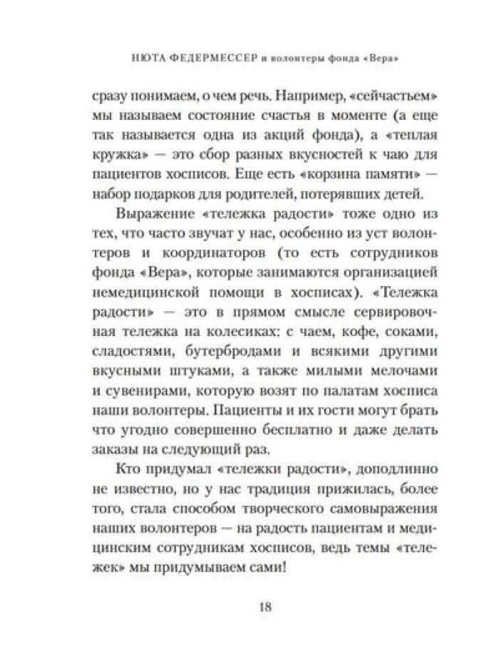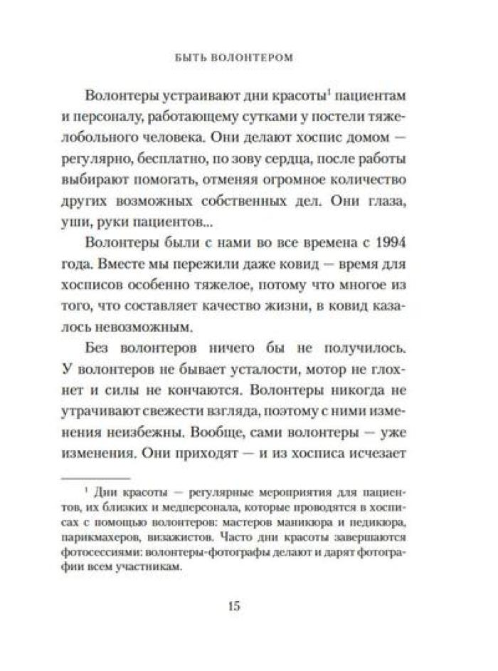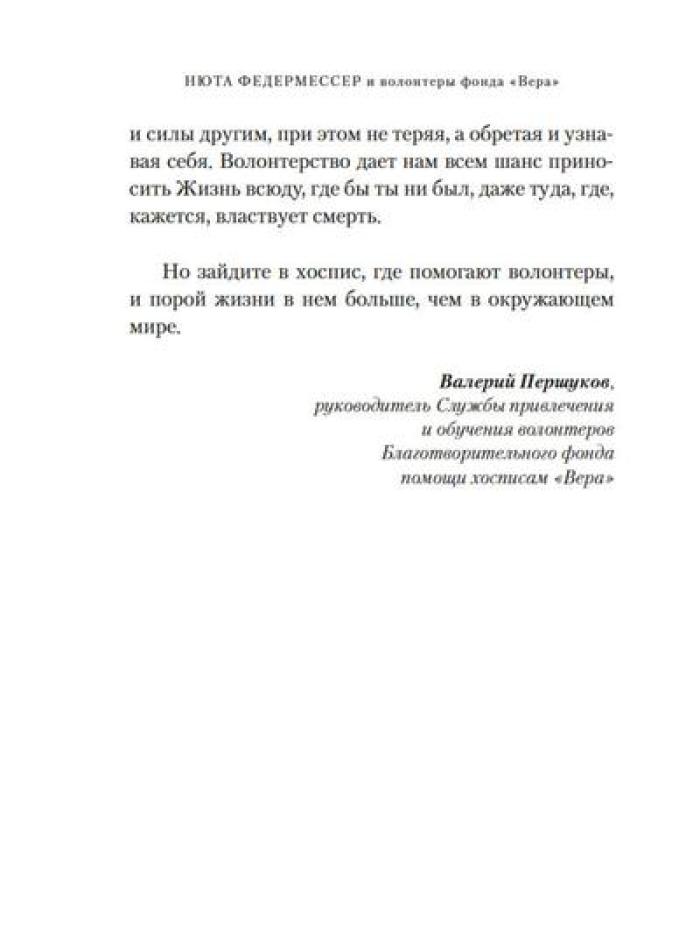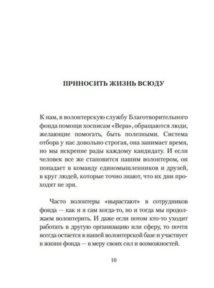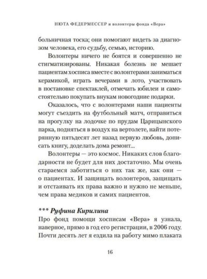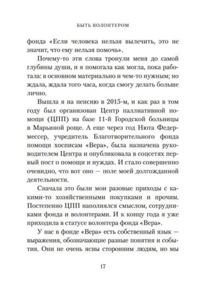 Каково это - быть волонтером? А быть волонтером в такой особенной сфере, как паллиативная и хосписная помощь? Какими путями приходят волонтеры в Благотворительный фонд помощи хосписам «Вера»? Что ими движет? Что им самим дает это высокое служение? Учредитель фонда Нюта Федермессер и волонтеры рассказывают истории из своей практики и делятся с читателями размышлениями о благотворительности и добровольческой деятельности. Сборник «Быть волонтером» - третий после книг «Камера хранения» и «Настоящее время», в которых Нюта Федермессер и ее коллеги и единомышленники говорят с нами о самом главном: о жизни, о любви, о смерти, о милосердии.| Издательство | КоЛибри |