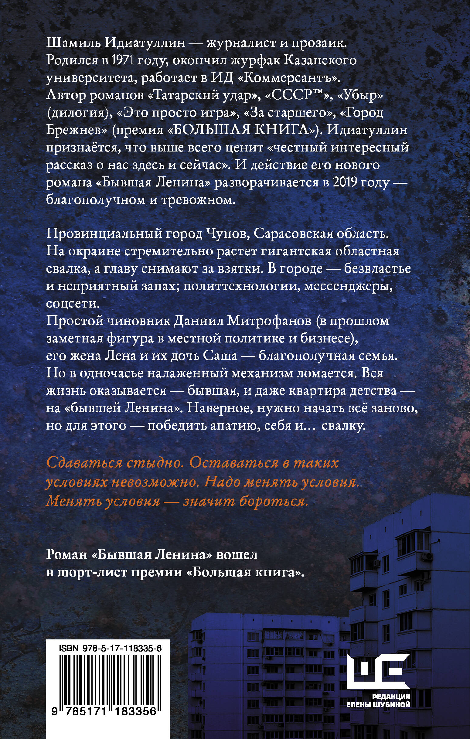 Новый роман лауреата премии "Большая книга", автора бестселлера "Город Брежнев". Старт новой серии "Актуальный роман": остросюжетная проза о современности. Честный рассказ о нас здесь и сейчас. Шамиль Идиатуллин - журналист и прозаик. Родился в 1971 году, окончил журфак Казанского университета, работает в ИД "Коммерсантъ". Автор романов "Татарский удар", "СССР™", "Убыр" (дилогия), "Это просто игра", "За старшего", "Город Брежнев" (премия "БОЛЬШАЯ КНИГА"). Идиатуллин признаётся, что выше всего ценит "честный интересный рассказ о нас здесь и сейчас". И действие его нового романа "Бывшая Ленина" разворачивается в 2019 году - благополучном и тревожном. Провинциальный город Чупов, Сарасовская область. На окраине стремительно растет гигантская областная свалка, а главу снимают за взятки. В городе - безвластье и неприятный запах; политтехнологии, мессенджеры, соцсети. Простой чиновник Даниил Митрофанов (а в прошлом заметная фигура в местной политике и бизнесе), его жена Лена и их дочь Саша - благополучная семья. Но в одночасье налаженный механизм ломается. Вся жизнь оказывается - бывшая, и даже квартира детства - на "бывшей Ленина". Наверное, нужно начать всё заново, но для этого - победить апатию, себя и… свалку. Сдаваться стыдно. Оставаться в таких условиях невозможно. Надо менять условия. Менять условия - значит бороться.| Издательство | Издательство "АСТ" |