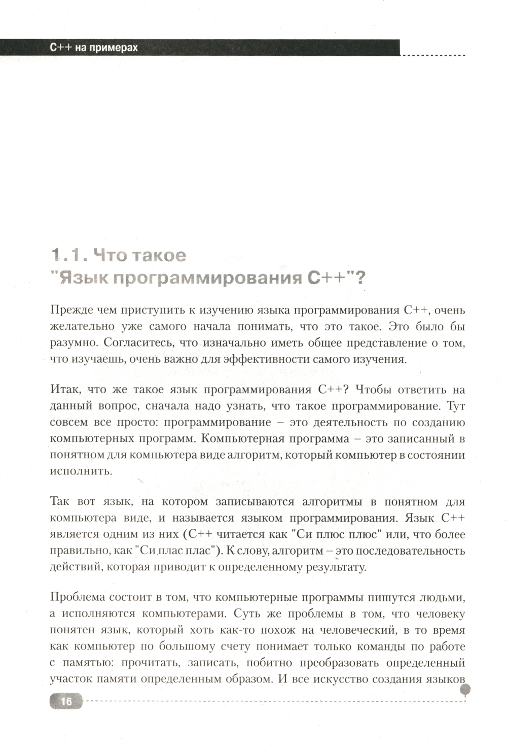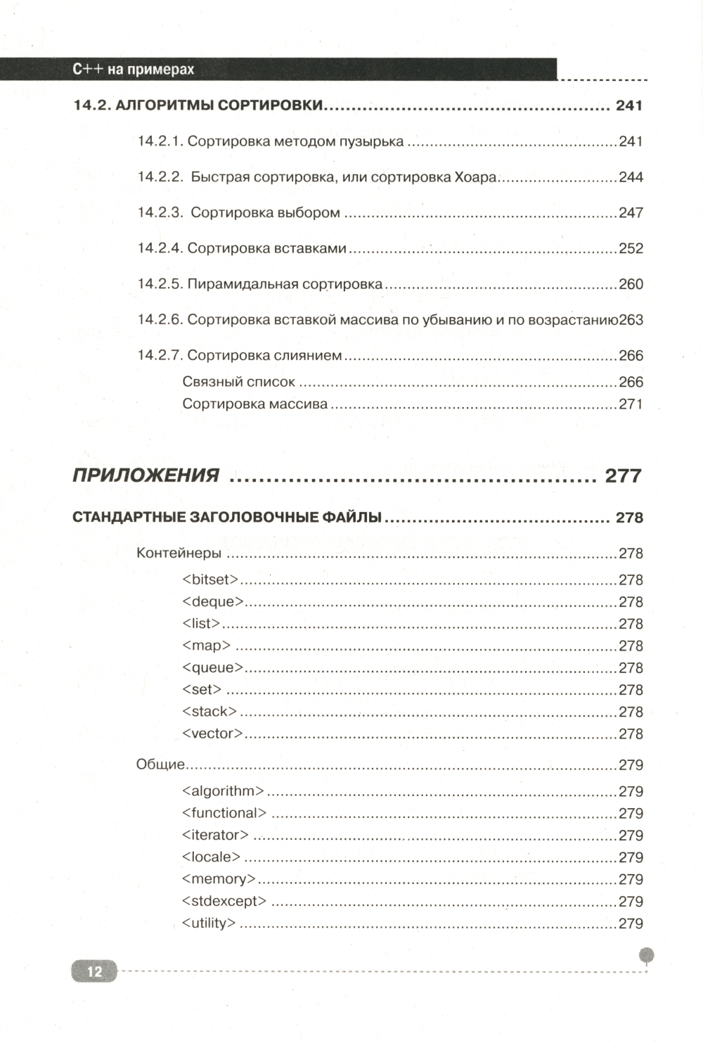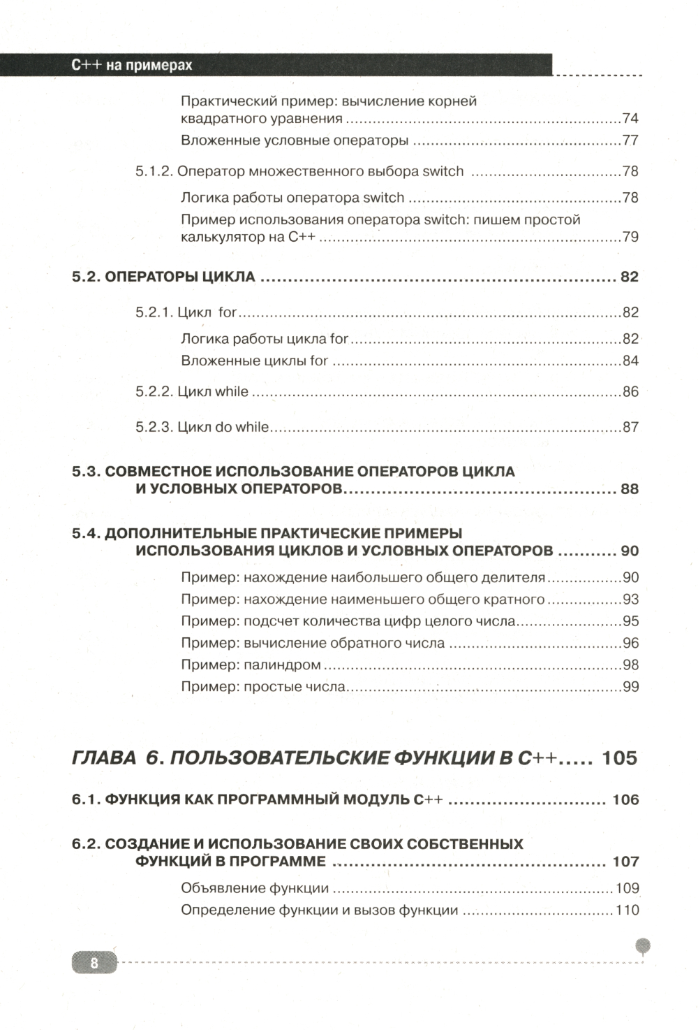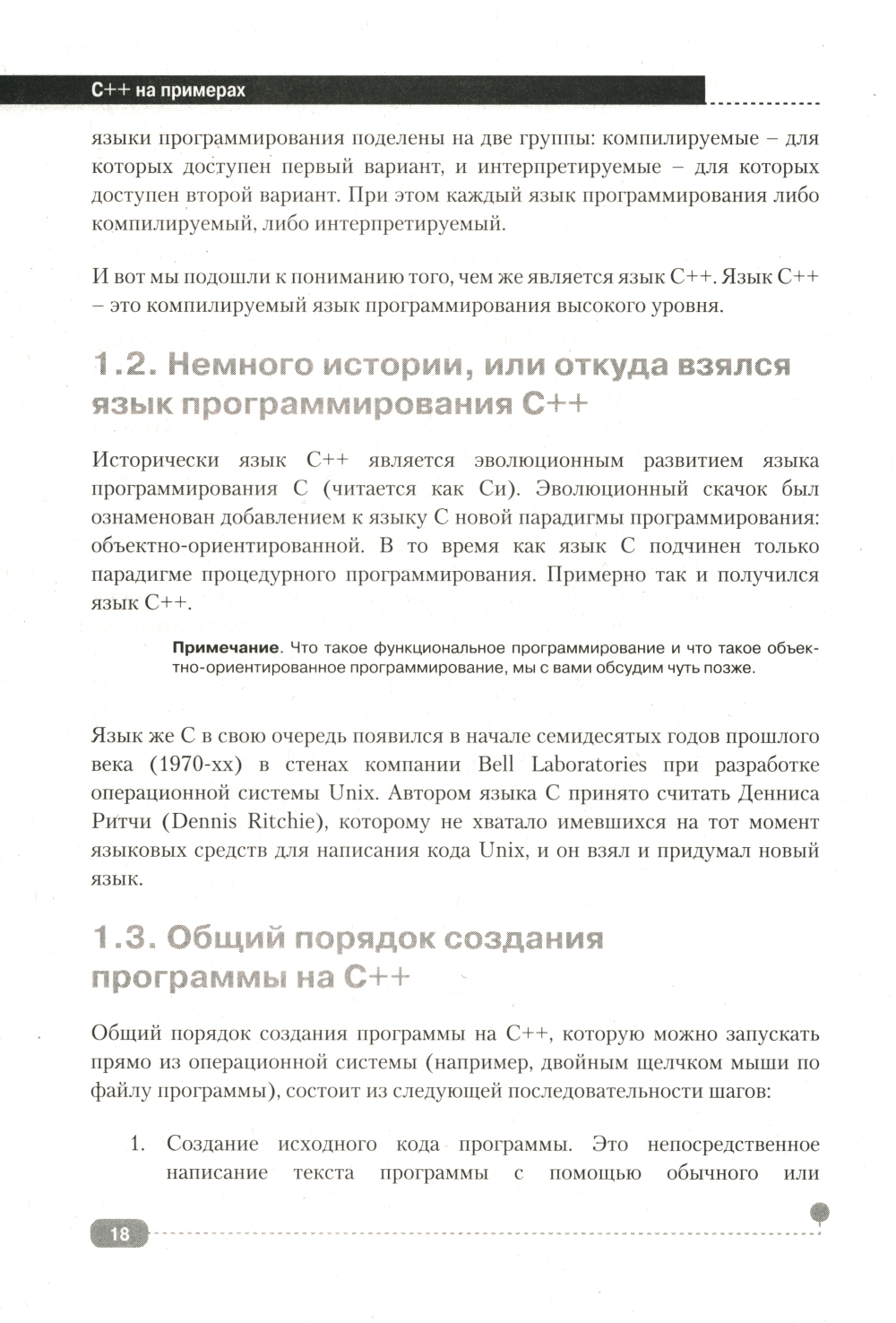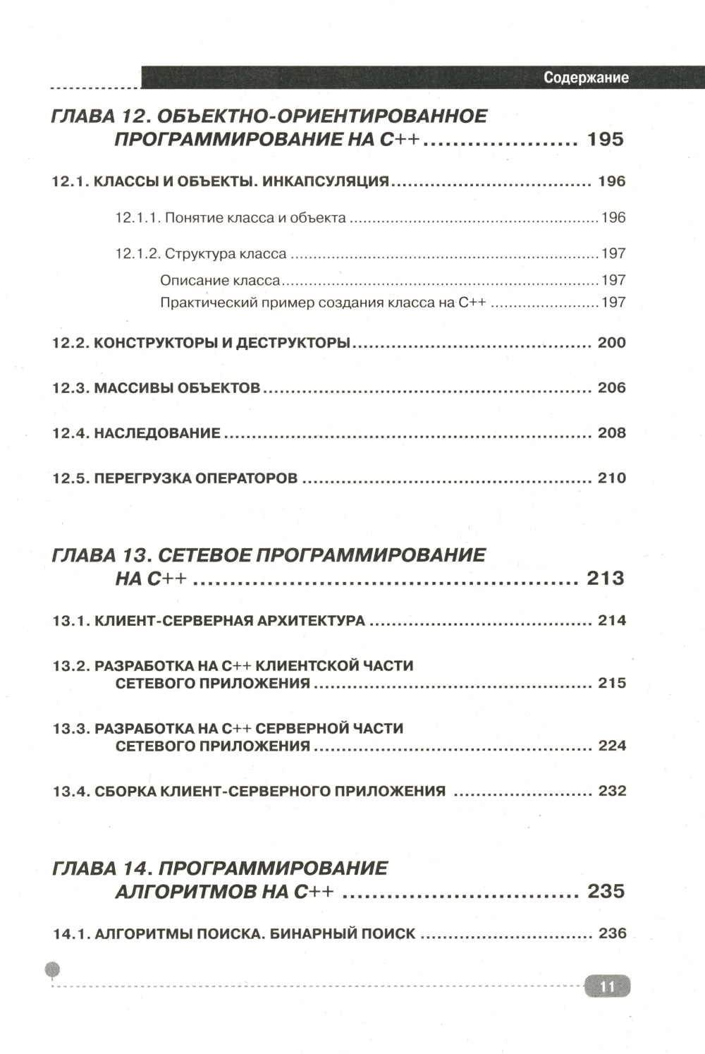 Эта книга является превосходным учебным пособием для изучения языка программирования С++ на примерах. В книге рассмотрена базовая теоретическая часть языка С++, позволяющая ориентироваться в языке и создавать свои программы: типы, функции, операторы, логические конструкции, массивы, указатели, структуры, работа с файлами, объектно-ориентированное программирование. Отдельное внимание уделено программированию различных алгоритмов. В книге используется большое количество примеров с подробным анализом кода: от простых приложений для вывода текста на экран и проведения вычислений до клиент-серверного приложения. Будет полезна как начинающим программистам, студентам, так и всем, кто хочет быстро начать программировать на С++.| Издательство | Наука и техника |