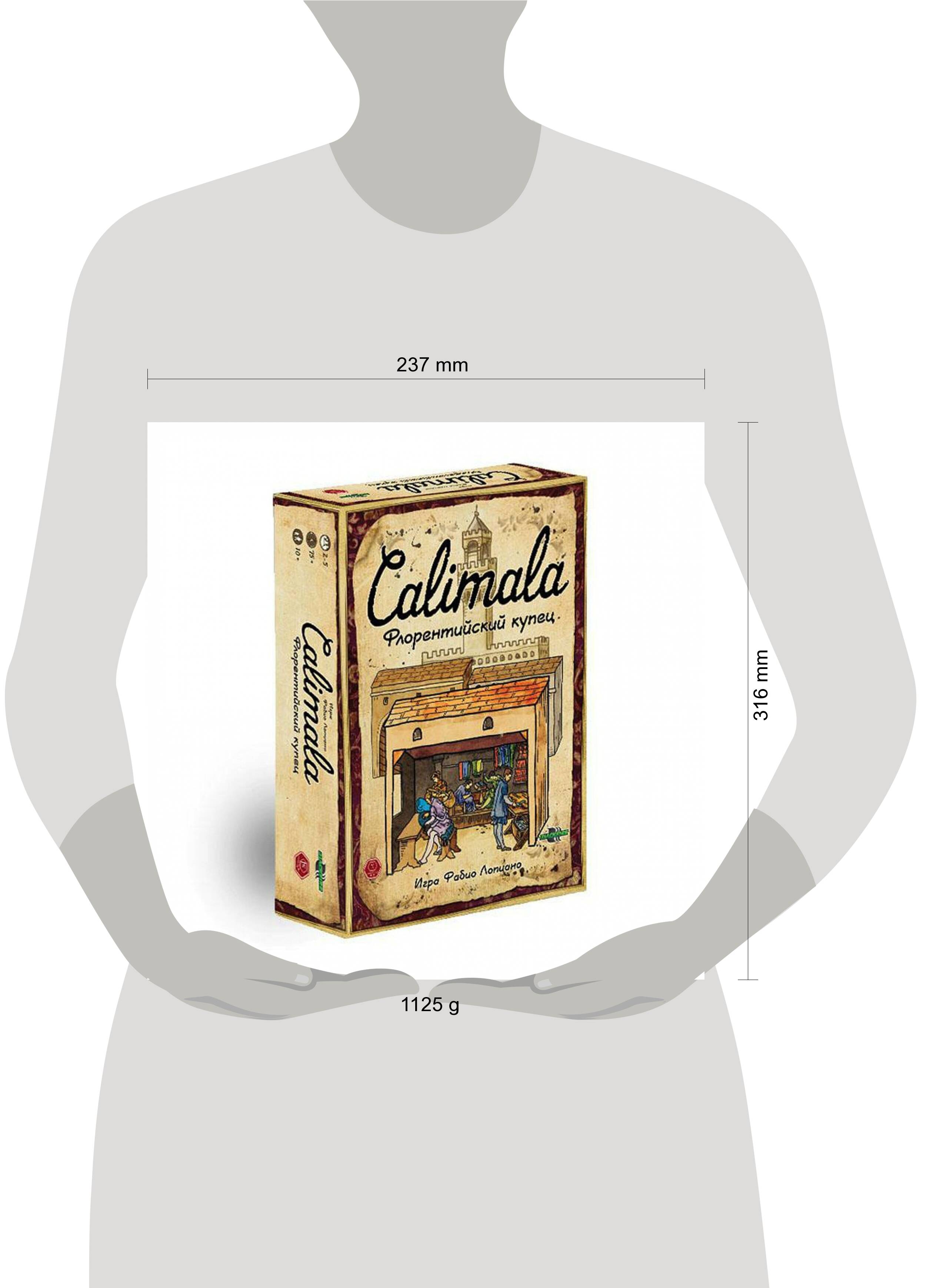 В игре "Calimala. Флорентийский купец"! Вы, как и другие игроки, выступаете в качестве привилегированного члена Arte di Calimala и конкурируете с ними за влияние в гильдии. Вы строите мастерские и производите ткань высочайшего качества, которую затем отправляете морем и по суше в важнейшие города Европы. Вы жертвуете материалы на возведение величественных соборов и украшаете их скульптурами. И, конечно, боретесь за места в городском совете для своих представителей! В игре уживаются еврогейм и умная стратегия с контролем областей влияния и свободным выбором действий. Она одинаково легко играется как втроём, так и впятером. В русской версии вас также ждёт режим игры вдвоём. В наборе: игровое поле; 8 жетонов действий; 15 жетонов влияния; 45 карт действий; 10 карт влияния; 5 планшетов игрока; 75 деревянных дисков; 200 деревянных кубиков; 15 деревянных фишек кораблей; 15 деревянных фишек торговых домов; 10 жетонов мастерских; фишка первого игрока из дерева; 5 жетонов "50 очков влияния"; правила игры для 2 игроков; правила игры на русском языке. Количество игроков: 2-5. Длительность игры: 45-75 минут. Возраст: 10+.