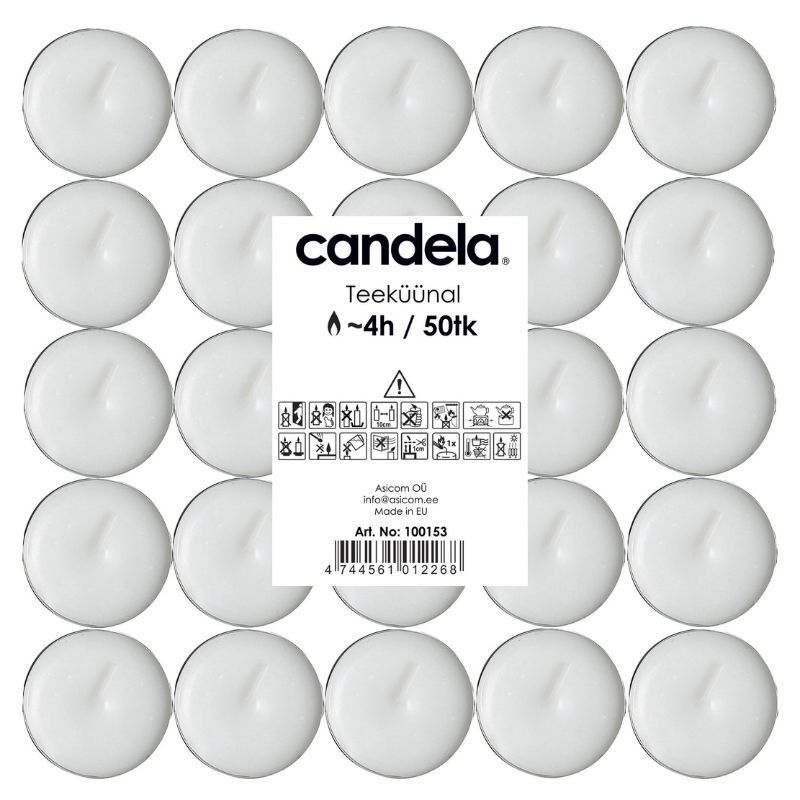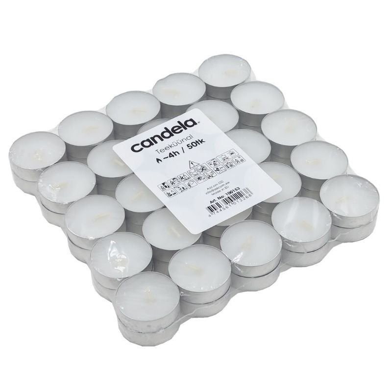 Candela Чайные свечи 50 шт - свечи, создающие тёплую и уютную атмосферу дома: мягкий свет идеально подходит для романтического ужина, расслабляющего вечера, тёплой ванны или тихого домашнего ритуала. Свечи компактные, удобно использовать в подсвечниках, на полке, на балконе или для дачи.Время горения около 4 часов.