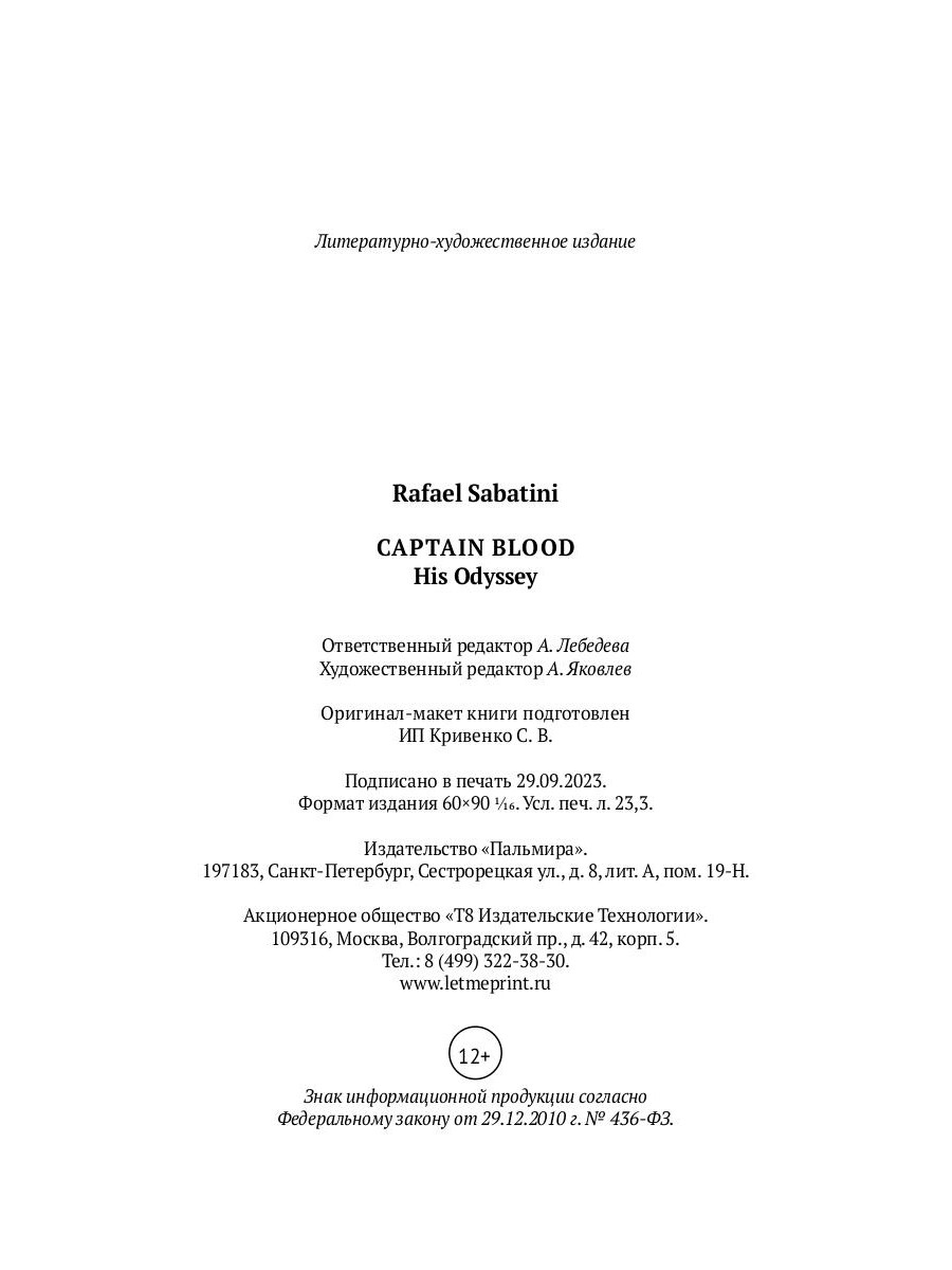 "Одиссея капитана Блада" - приключенческий роман, подаривший всемирную известность ее автору, английскому писателю, итальянцу по происхождению, Рафаэлю Сабатини (1875-1950). Честный и великодушный врач Питер Блад имел неосторожность оказать помощь раненому участнику восстания в эпоху сурового правления короля Якова II. За милосердие, проявленное к мятежнику, он оказывается сослан в английские колонии в Вест-Индии, где лишается всех прав и становится рабом. Не желая мириться с такой участью, Блад присоединяется к группе пиратов, а спустя недолгое время сам становится грозой Южных морей, знаменитым капитаном Бладом - благородным преступником, борющимся за истинную справедливость. Захватывающий роман, исполненный похищенных сокровищ и сражений в открытом океане, был впервые опубликован в 1922 году и всего несколько лет спустя стал признанной во всем мире классикой. Неадаптированное издание на английском языке.