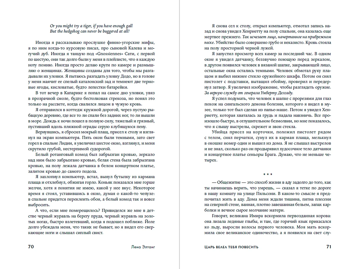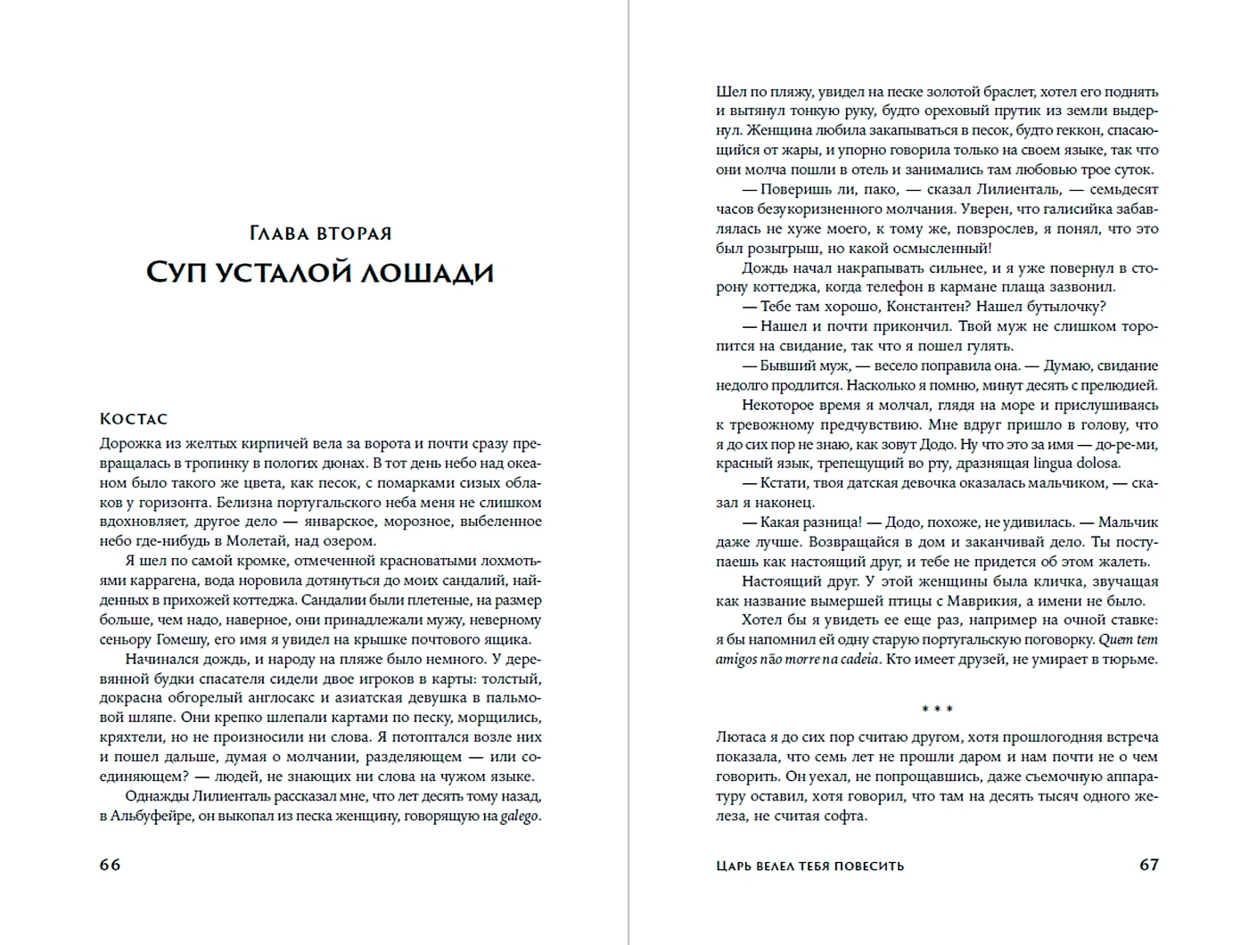 «Царь велел тебя повесить» - это не только роман о невинном человеке, которого обвиняют в убийстве, или, скажем, роман о молодом повесе, который распродает фамильное гнездо и держит пепел любимой женщины в шляпной коробке. Это история о любви и вражде, которые, даже по прошествии многих лет, продолжают вести героя по лабиринту трагических событий, по путям заблуждений и обольщений, вины и стыда, заставляя вернуться в прошлое, открыть глаза и встретиться со своим Минотавром.