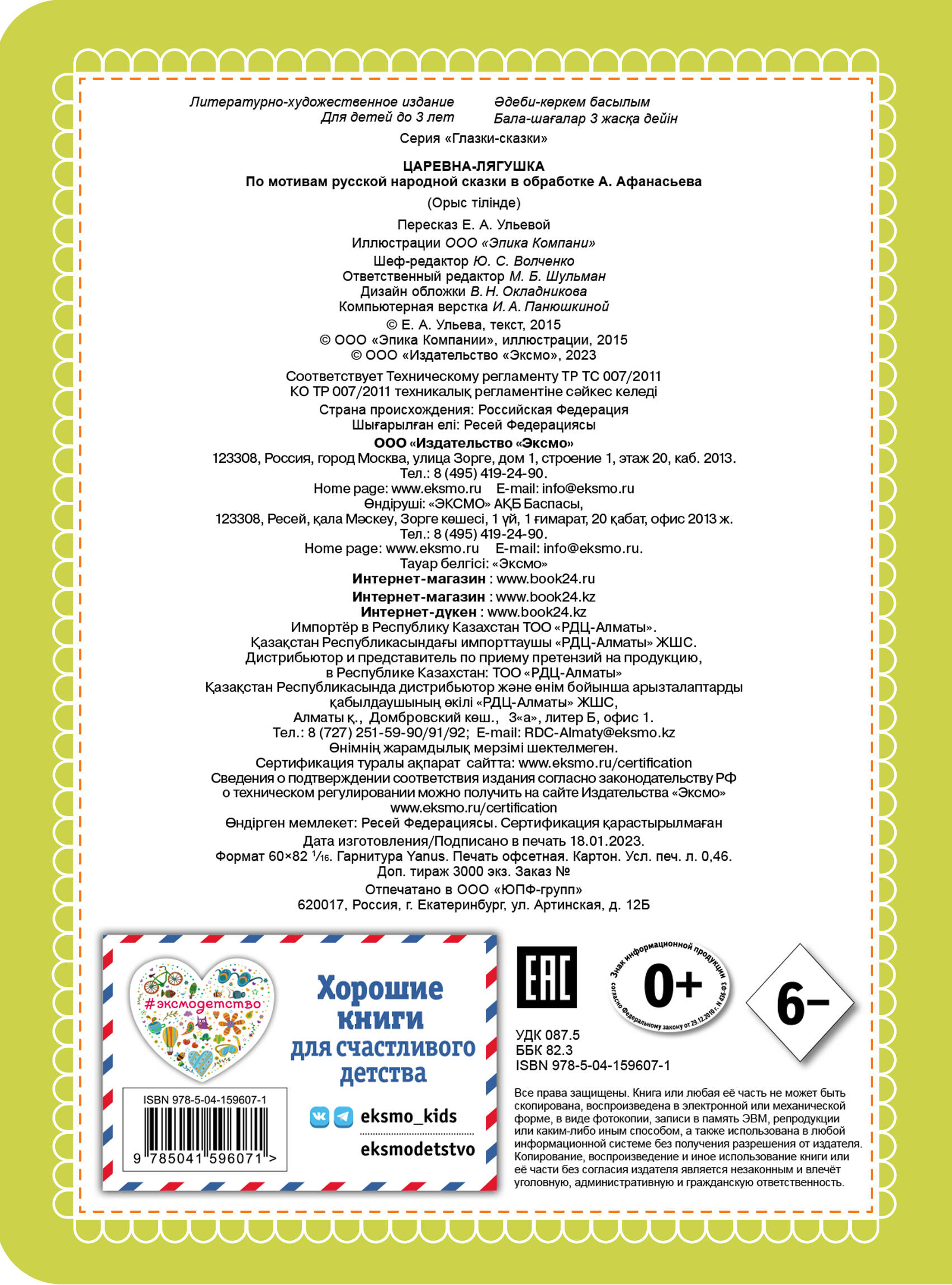 Русская народная сказка «Царевна-лягушка» представлена в самом удобном для малышей формате - прочные картонные страницы, закруглённые края, красочные иллюстрации. А чтобы ребёнку было ещё интересней знакомиться с историей, на каждом развороте у героя есть подвижные пластиковые глазки. Читайте сказку вместе с увлечённым малышом!| Издательство | Эксмо |