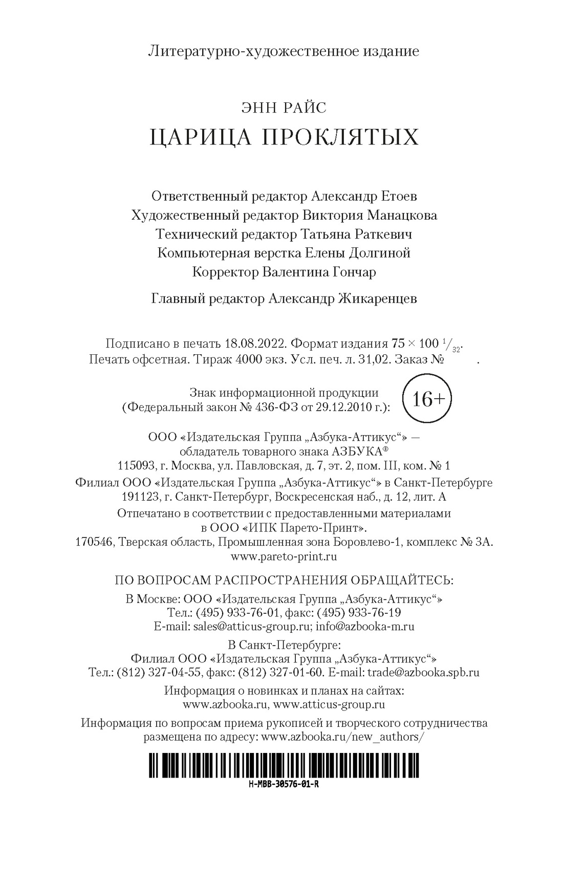 Царица Египта, Мать всех вампиров, пробудилась наконец от шеститысячелетнего сна. Ее мечта - спасти человечество и царствовать вместе с вампиром Лестатом в новом, построенном по вампирским законам мире. Но разве первородное зло способно создать красоту и гармонию? Могущественные Дети Тысячелетий должны решить сложнейшую из проблем: найти способ противостоять Царице Проклятых, отомстить ей за те страдания, которые она причинила многим, - противостоять и при этом выжить, потому что ее уничтожение грозит гибелью всему вампирскому роду. Первый роман писательницы «Интервью с вампиром», открывший цикл «Вампирские хроники», стал настоящим событием в мире литературы. Своим появлением в 1973 году он предвосхитил знаменитые «Сумерки» Стефани Майер, а фильм 1994 года с Томом Крузом, Брэдом Питтом и Антонио Бандерасом в главных ролях принес книге еще большую популярность. Общий ее тираж превысил рекордные 15 миллионов экземпляров, это едва ли не самая продаваемая из книг современных авторов в истории книжной торговли.| Издательство | Азбука |