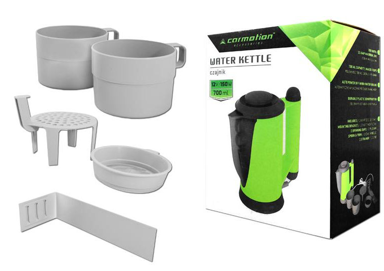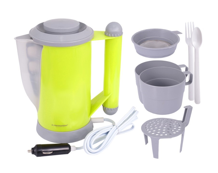 Подходит для грузовиков, лодок, кемперов и других транспортных средств с питанием 12 В. Идеально подходит для приготовления горячей воды, кофе, чая, супа, закусок и подогрева детских бутылочек. В комплект входят вилка и ложка (в ручке), 2 чашки, ситечко и монтажный кронштейн. Налейте в чайник чистую воду так, чтобы ее уровень находился между показаниями MIN и MAX, затем подключите его напрямую к розетке 12 В.