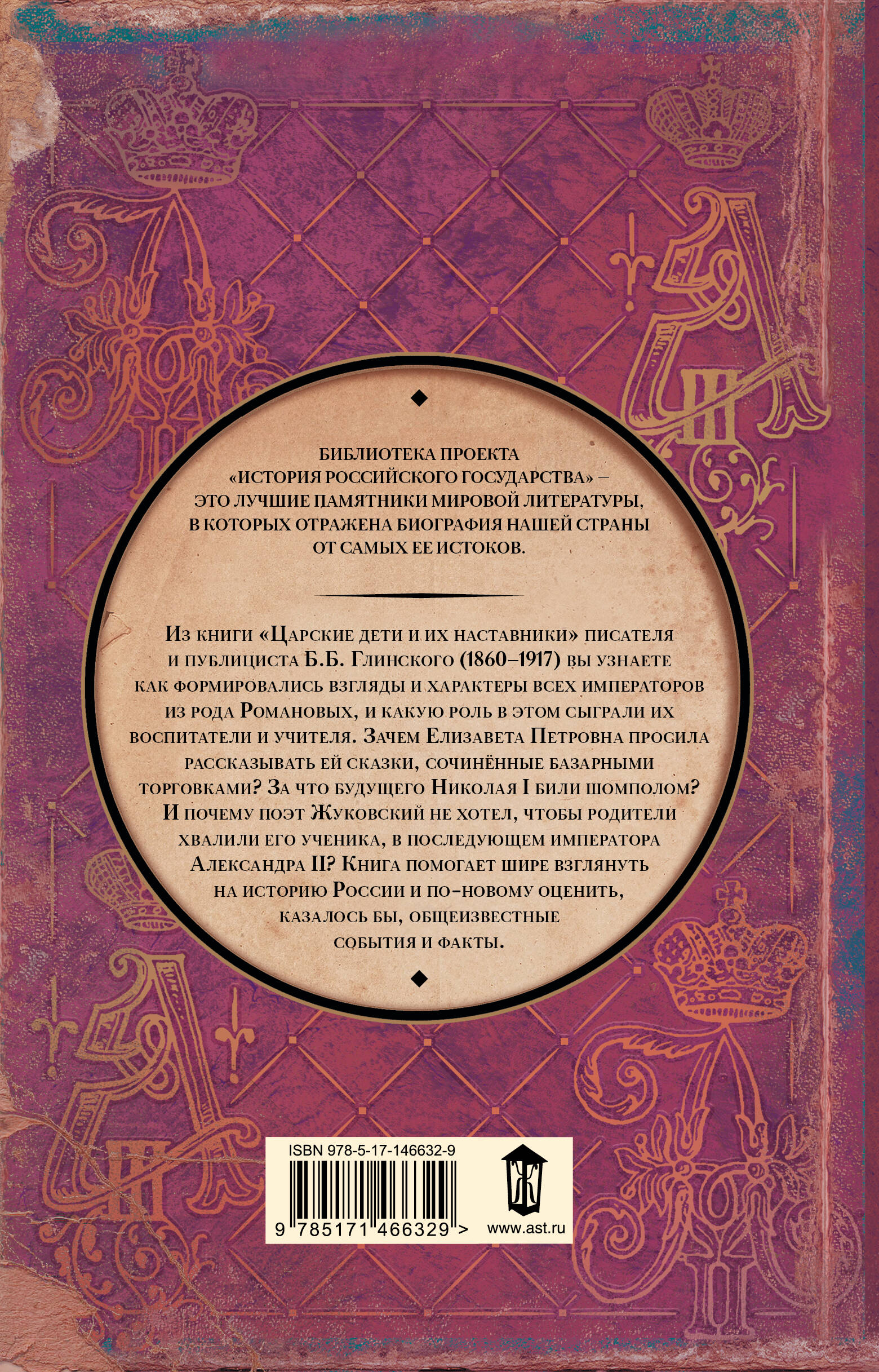 Из книги «Царские дети и их наставники» писателя и публициста Б.Б. Глинского (1860-1917) вы узнаете как формировались взгляды и характеры всех императоров из рода Романовых, и какую роль в этом сыграли их воспитатели и учителя. Зачем Елизавета Петровна просила рассказывать ей сказки, сочинённые базарными торговками? За что будущего Николая I били шомполом? И почему поэт Жуковский не хотел, чтобы родители хвалили его ученика, в последующем императора Александра II? Книга помогает шире взглянуть на историю России и по-новому оценить, казалось бы, общеизвестные события и факты.