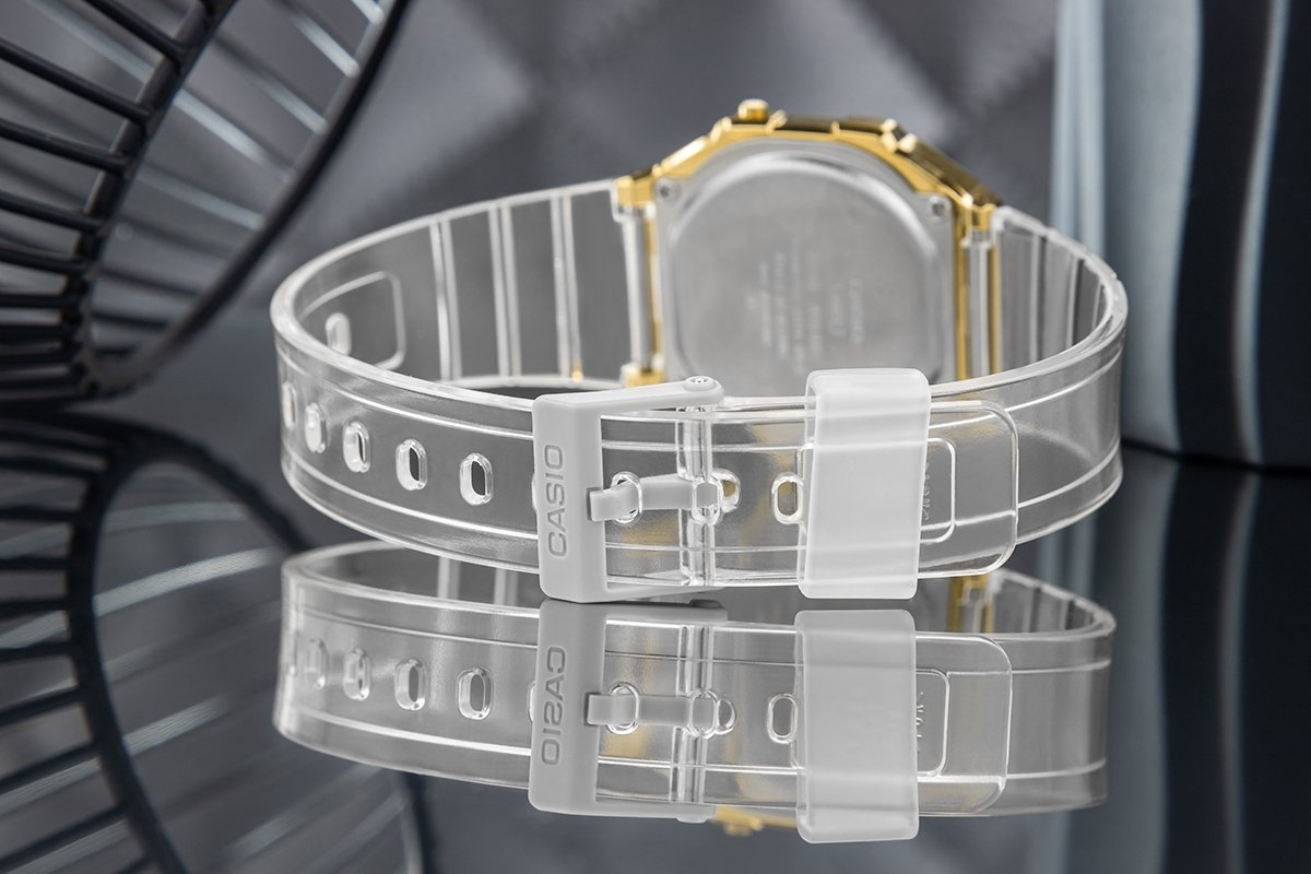 Модель CASIO A168XESG - это тонкий золотой блеск, легкость прозрачного ремешка и вневременная форма - минимализм с характером. для женщин, которые любят стиль, душу и ценность, аксессуары, рассказывающие историю. Описание продукта: