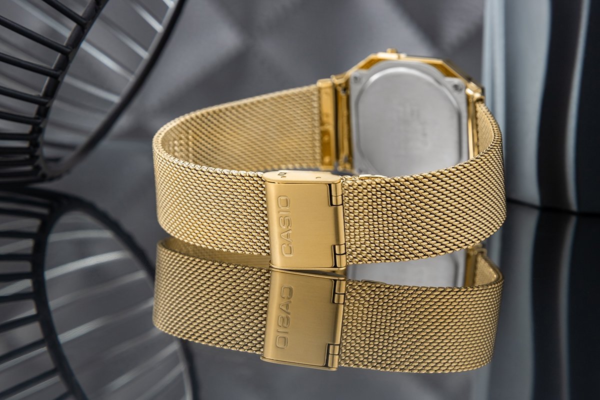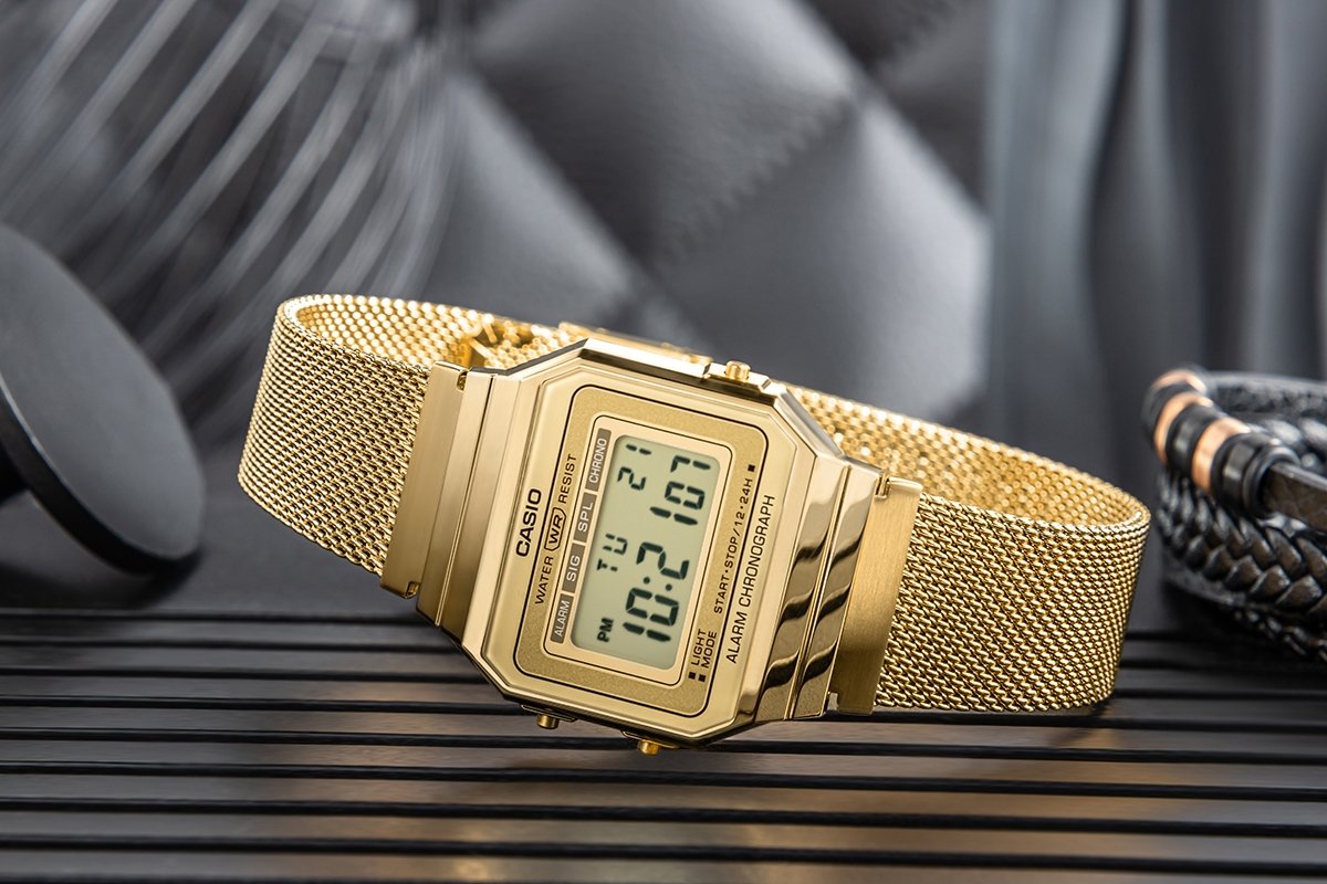 Casio A700WMG‑9A - Унисекс-часы серии Vintage в золотом цвете с цифровым дисплеем и сетчатым браслетом. Корпус толщиной 6 мм и вес около 53 г делают модель лёгкой и удобной для повседневной носки. Функции включают секундомер, будильник, авто-календарь и LED-подсветку. Стильный ретро-дизайн подходит и мужчинам, и женщинам.