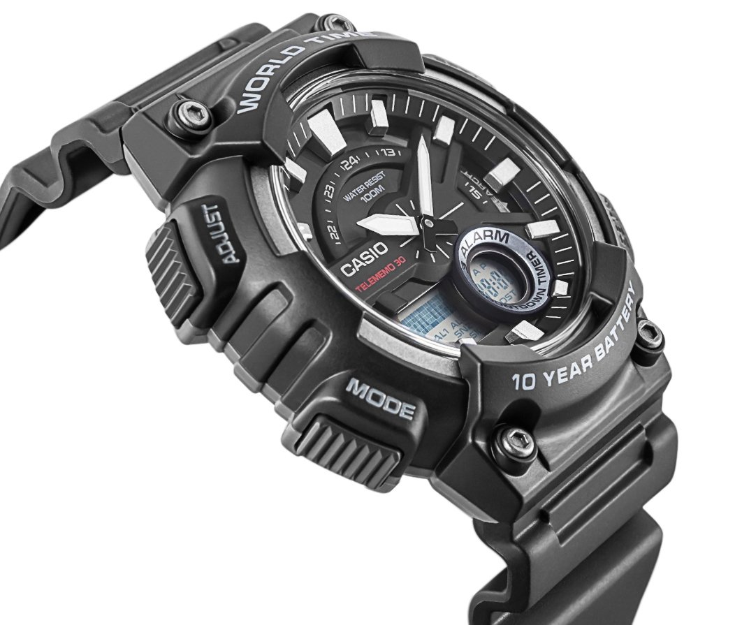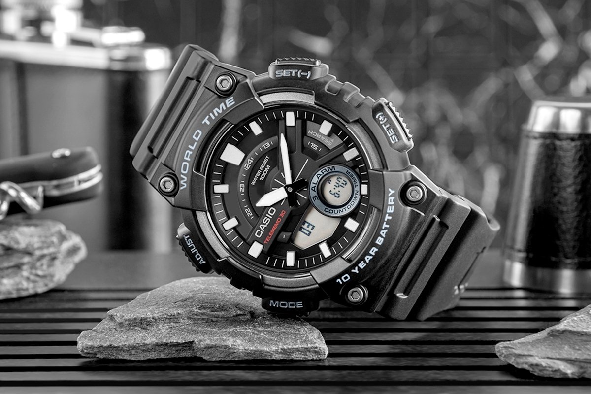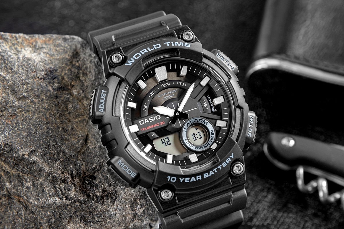 Описание продукта:<br /><br /> • Бренд: CASIO.<br /><br /> • Артикул: AEQ-110W-1AVDF.<br /><br /> • Механизм: кварцевый, на батарейке, с часовой и минутной стрелками.<br /><br /> • Циферблат: аналоговый - цифровой 3D<br /><br /> • Корпус: Материал смола Смола<br /><br /> • Кристалл: кристалл из смолы, стекло из смолы.<br /><br /> • Ремешок: Материал смола Смола.<br /><br /> • Стандартные функции (цифровой циферблат): часы, минуты, секунды, A/P, месяц, дата, день недели.<br /><br /> • А: люминесцентное покрытие Neobrite люминесцентное свечение на руках<br /><br /> • ВОДОНЕПРОНИЦАЕМОСТЬ: 10 бар - подходит для плавания.<br /><br /> • Гипоаллергенный: Да, не содержит никеля.<br /><br /> • Батарея: срок службы батареи 10 лет (батарея 10 лет).<br /><br /> • Корпус: 52 x 48 мм.<br /><br /> • Толщина: 14,2 мм.<br /><br /> • Ширина ремешка: 28/20 мм.<br /><br /> • Окружность запястья: максимум 230 мм. Цветовая гамма:<br /><br /> • Чехол/ремешок: черный.<br /><br /> • Циферблат 3D: черный<br /><br /> • часовые метки: серебро<br /><br /> • Стрелки: серебро + покрытие Neobrite люминесцентное свечение 10 лет Срок службы батареи - надежность и комфорт с Casio