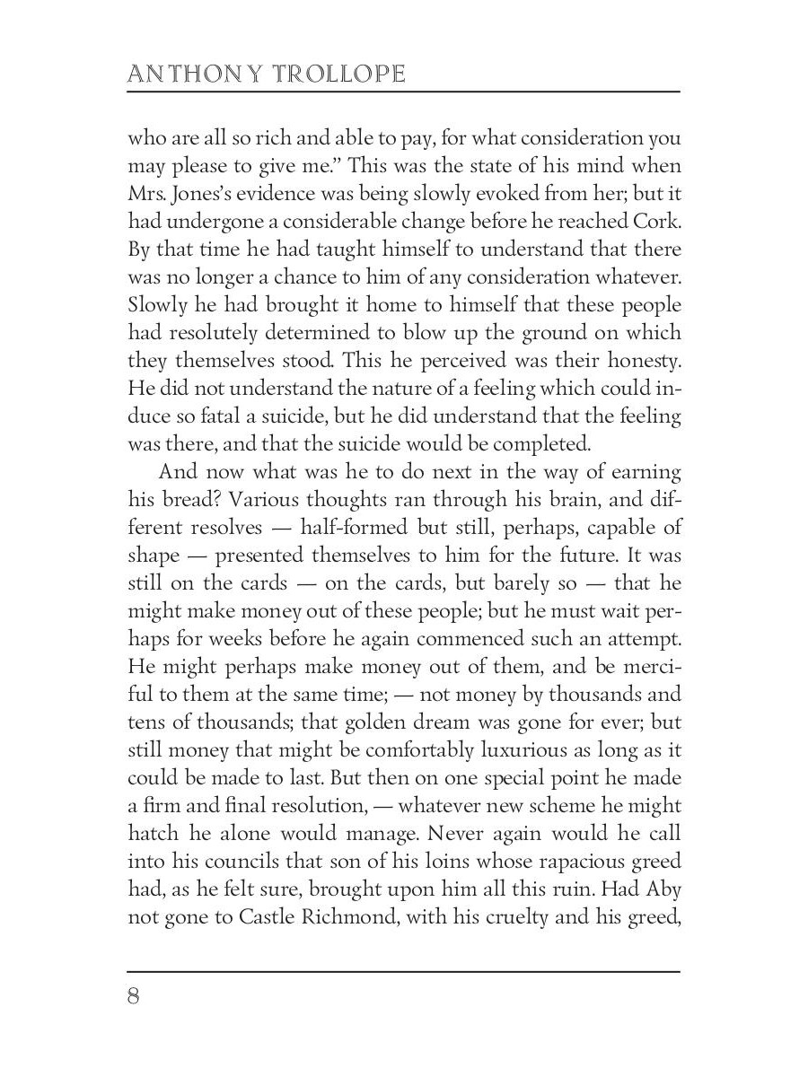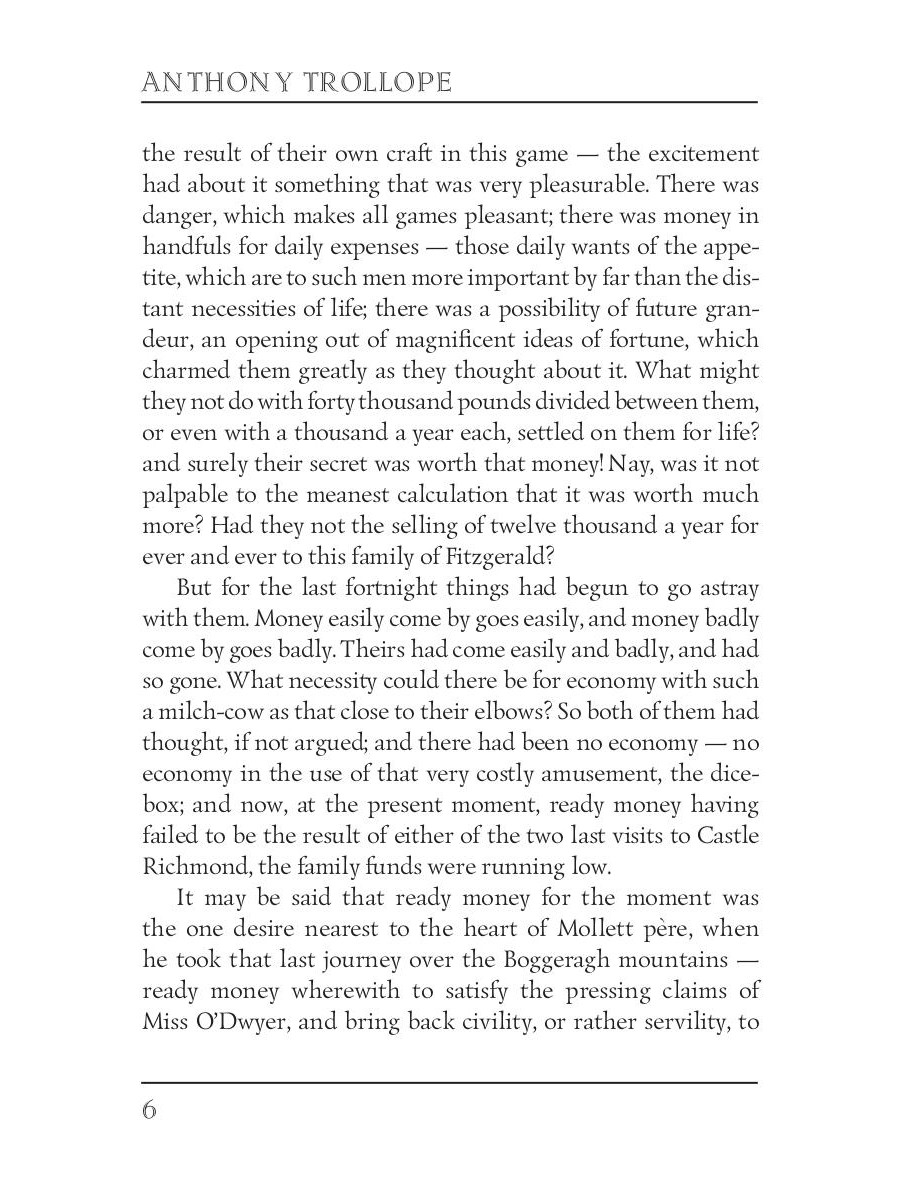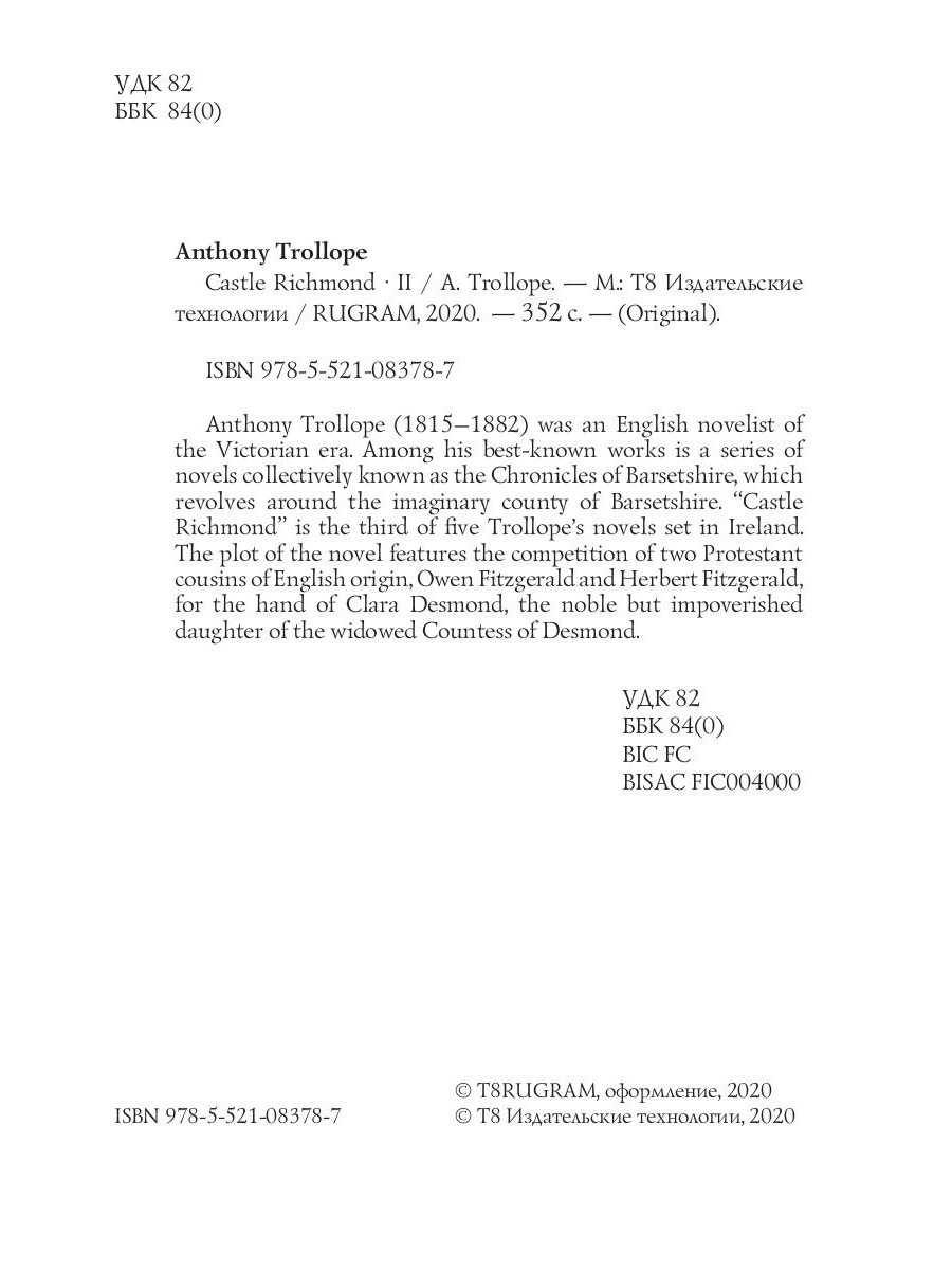 Anthony Trollope (1815-1882) was an English novelist of the Victorian era. Among his best-known works is a series of novels collectively known as the Chronicles of Barsetshire, which revolves around the imaginary county of Barsetshire. "Castle Richmond" is the third of five Trollope's novels set in Ireland. The plot of the novel features the competition of two Protestant cousins of English origin, Owen Fitzgerald and Herbert Fitzgerald, for the hand of Clara Desmond, the noble but impoverished daughter of the widowed Countess of Desmond.| Издательство | Т8 RUGRAM |
