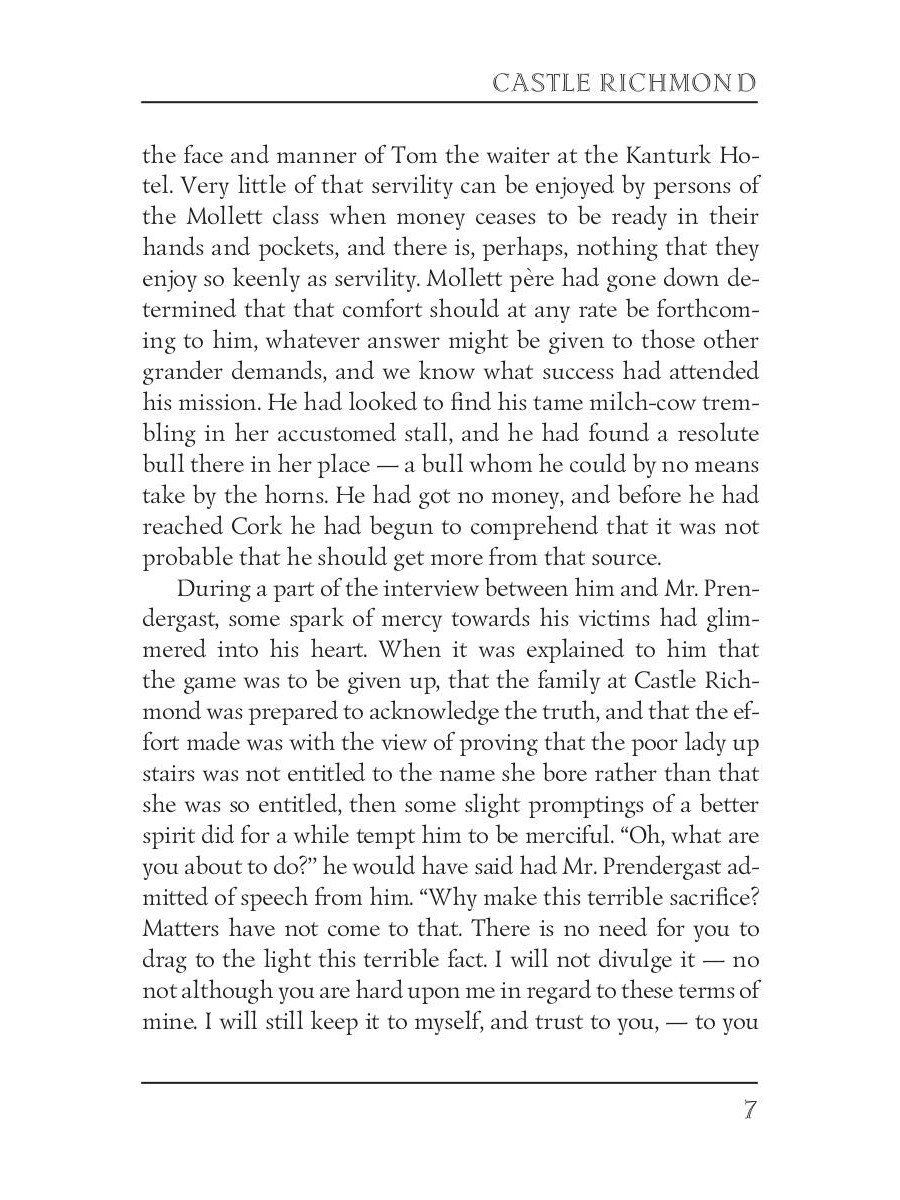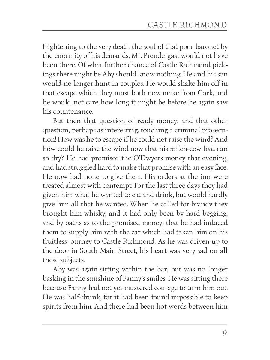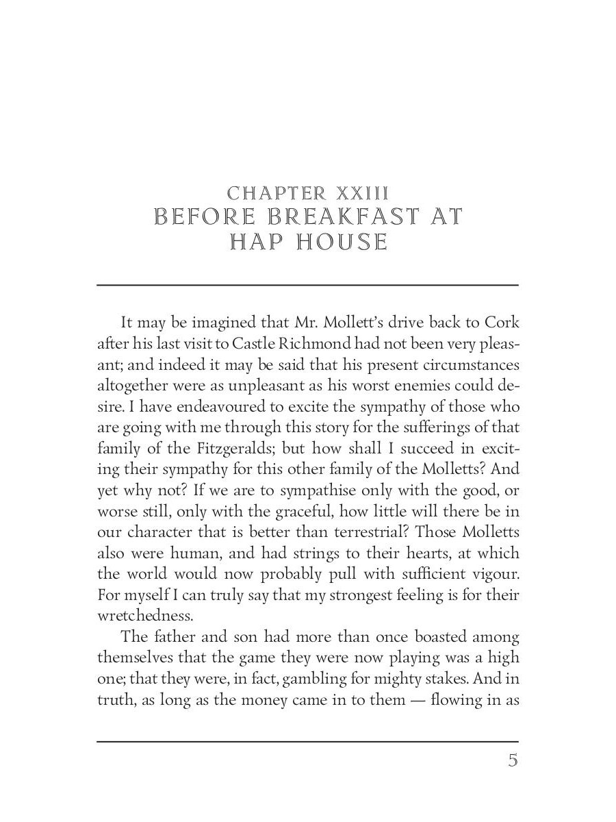 Anthony Trollope (1815-1882) was an English novelist of the Victorian era. Among his best-known works is a series of novels collectively known as the Chronicles of Barsetshire, which revolves around the imaginary county of Barsetshire. "Castle Richmond" is the third of five Trollope's novels set in Ireland. The plot of the novel features the competition of two Protestant cousins of English origin, Owen Fitzgerald and Herbert Fitzgerald, for the hand of Clara Desmond, the noble but impoverished daughter of the widowed Countess of Desmond.| Издательство | Т8 RUGRAM |