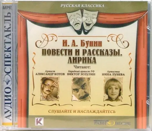 На диске собраны повести, рассказы и стихи разных лет: "Антоновские яблоки", "Чистый понедельник", "Солнечный удар", "Легкое дыхание", "Господин из Сан-Франциско" и другие произведения о смысле жизни, о любви, о будущем. Даже если вы читали эти произведения, послушайте их в блистательном актерском исполнении, и Вам откроются новые грани русской классической литературы. Аудиокнига содержит звуковые файлы и электронный текст произведений. Текст читают: Виктор Зозулин, Александр Котов, Нина Лунева. Время звучания: 7 часов 46 минут. - CD, VCD, DVD аппаратуре со встроенным декодером MP3 - персональном компьютере. Системные требования: процессор Pentium II, память 256 МБ ОЗУ, дисковод CD/DVD-ROM, Windows 98/2000/XP, звуковая карта, колонки аудиосистемы с поддержанием формата MP3. Характеристики записи: формат MP3 - 192 кБит/сек, 44,1 кГц.