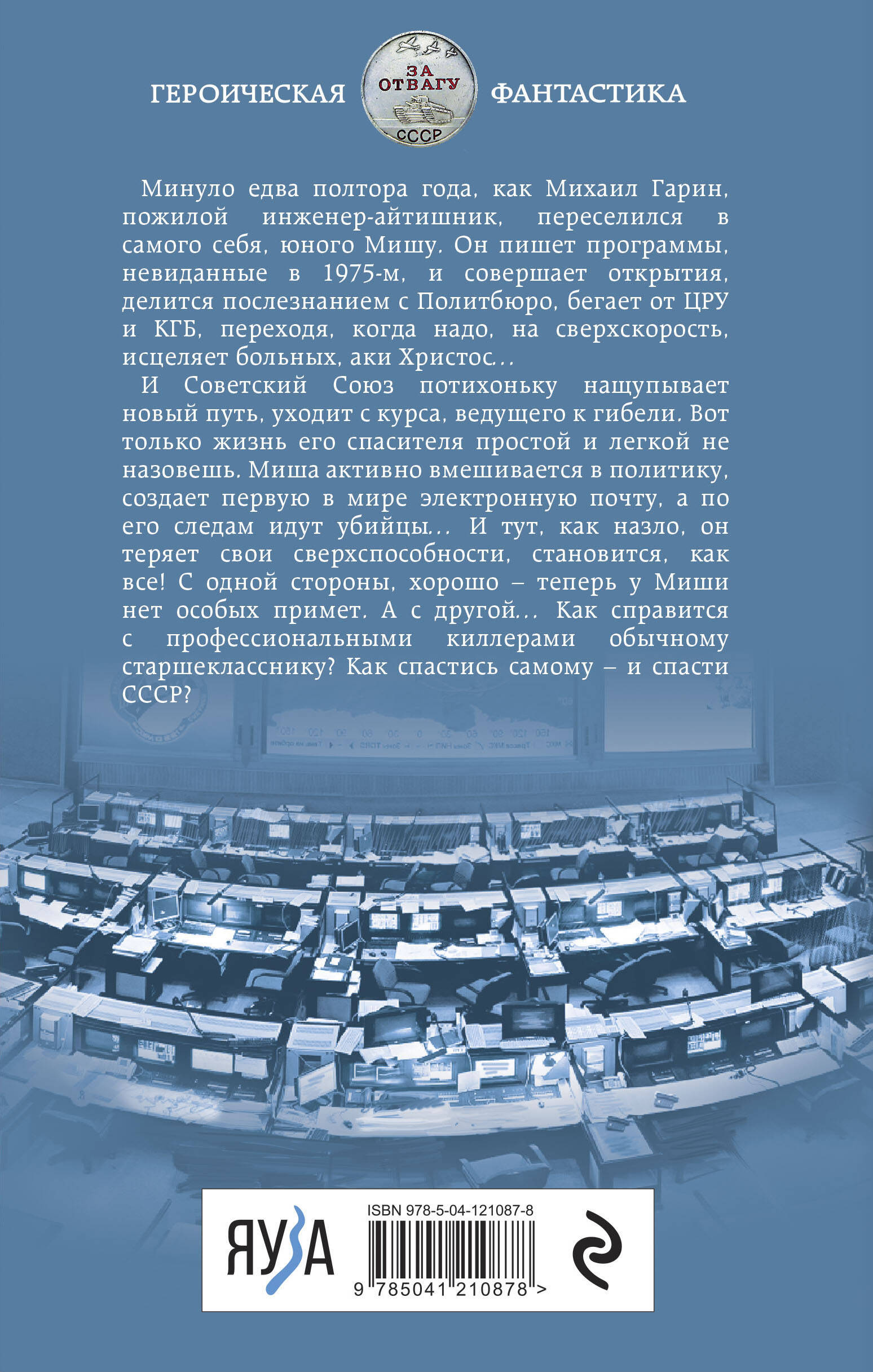 Продолжение приключений инженера-программиста из нашего времени, заброшенного в 1974 год, чтобы предотвратить распад СССР. Минуло едва полтора года, как Михаил Гарин, пожилой инженер-айтишник, переселился в самого себя, юного Мишу. Он пишет программы, невиданные в 1975-м, и совершает открытия, делится послезнанием с Политбюро, бегает от ЦРУ и КГБ, переходя, когда надо, на сверхскорость, исцеляет больных, аки Христос… И Советский Союз потихоньку нащупывает новый путь, уходит с курса, ведущего к гибели. Вот только жизнь его спасителя простой и легкой не назовешь. Миша активно вмешивается в политику, создает первую в мире электронную почту, а по его следам идут убийцы… И тут, как назло, он теряет свои сверхспособности, становится, как все! С одной стороны, хорошо - теперь у Миши нет особых примет. А с другой… Как справиться с профессиональными киллерами обычному старшекласснику? Как спастись самому - и спасти СССР?| Издательство | ООО "Издательство "Эксмо" |
