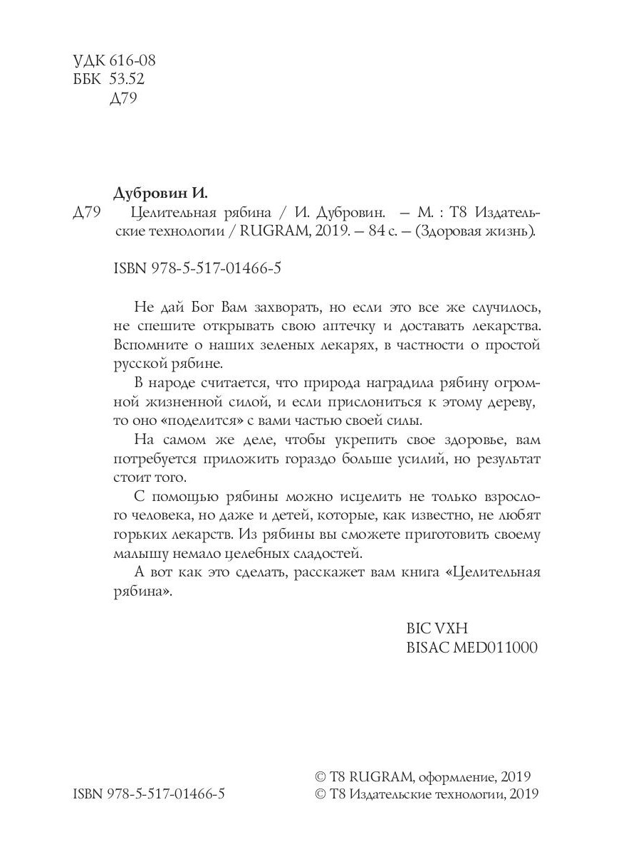 Не дай Бог Вам захворать, но если это все же случилось, не спешите открывать свою аптечку и доставать лекарства. Вспомните о наших зеленых лекарях, в частности о простой русской рябине. В народе считается, что природа наградила рябину огромной жизненной силой, и если прислониться к этому дереву, то оно «поделится» с вами частью своей силы. На самом же деле, чтобы укрепить свое здоровье, вам потребуется приложить гораздо больше усилий, но результат стоит того. С помощью рябины можно исцелить не только взрослого человека, но даже и детей, которые, как известно, не любят горьких лекарств. Из рябины вы сможете приготовить своему малышу немало целебных сладостей. А вот как это сделать, расскажет вам книга «Целительная рябина».| Издательство | Т8 RUGRAM |