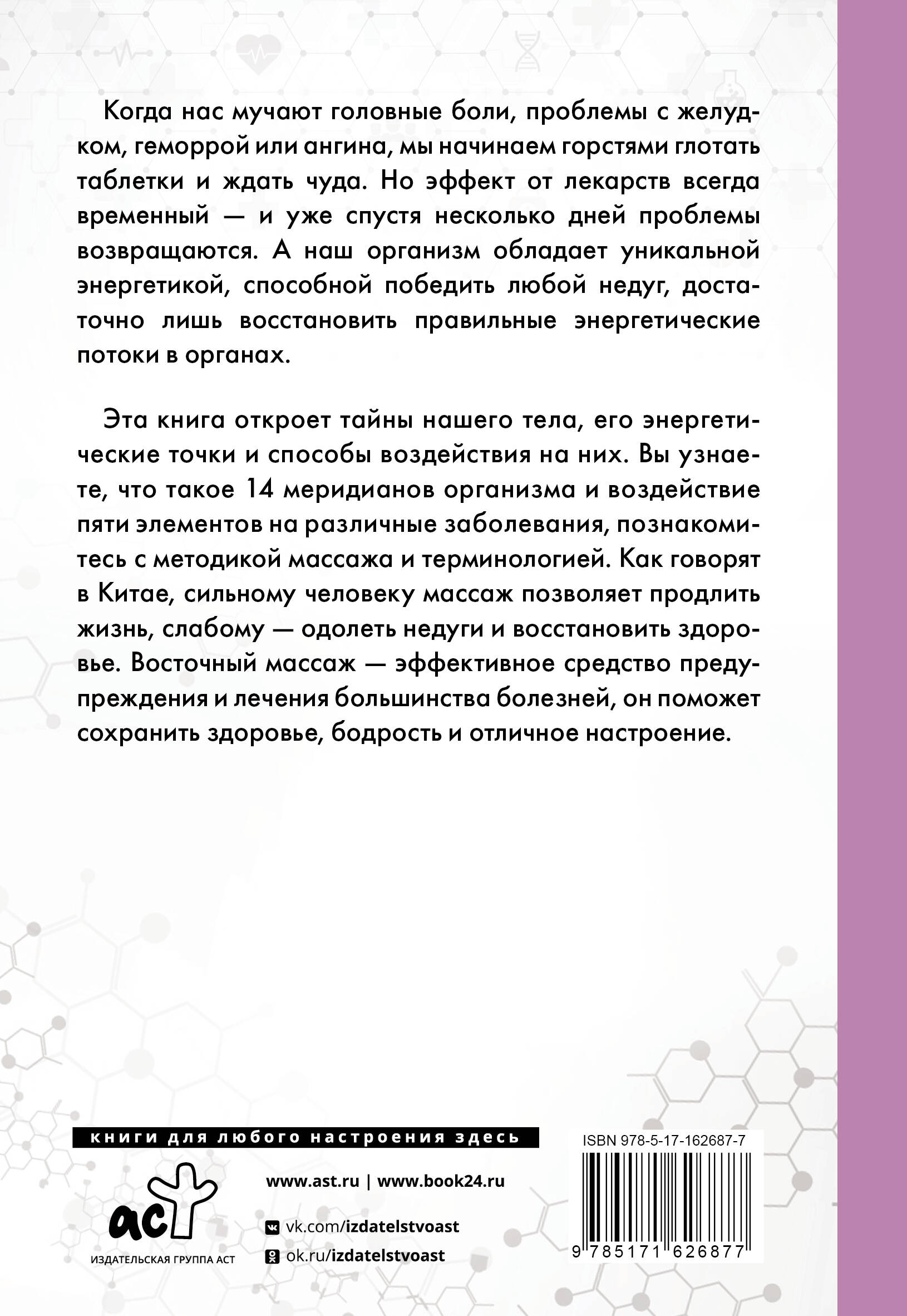 Когда нас мучают головные боли, проблемы с желудком, геморрой или ангина, мы начинаем горстями глотать таблетки и ждать чуда. Но эффект от лекарств всегда временный - и уже спустя несколько дней проблемы возвращаются. А наш организм обладает уникальной энергетикой, способной победить любой недуг, достаточно лишь восстановить правильные энергетические потоки в органах. Эта книга откроет тайны нашего тела, его энергетические точки и способы воздействия на них. Вы узнаете, что такое 14 меридианов организма и воздействие пяти элементов на различные заболевания, познакомитесь с методикой массажа и терминологией. Как говорят в Китае, сильному человеку массаж позволяет продлить жизнь, слабому - одолеть недуги и восстановить здоровье. Восточный массаж - эффективное средство предупреждения и лечения большинства болезней, он поможет сохранить здоровье, бодрость и отличное настроение.| Издательство | Издательство "АСТ" |