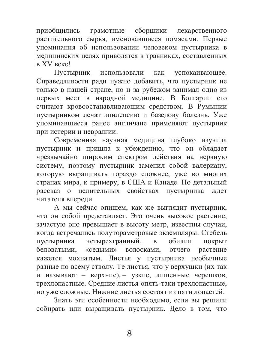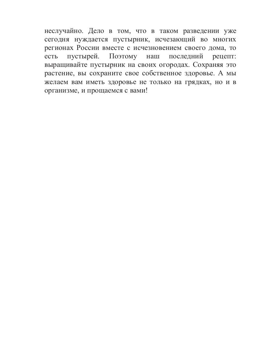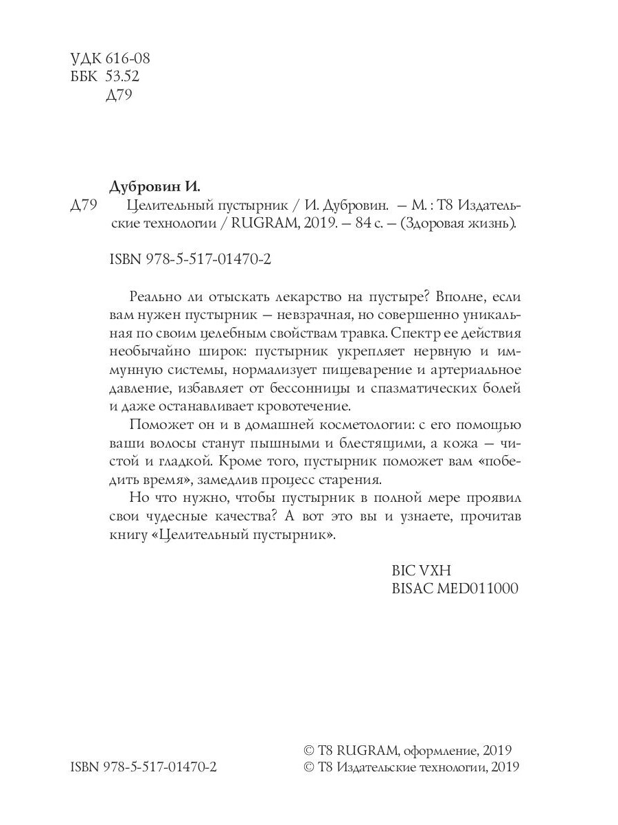 Реально ли отыскать лекарство на пустыре? Вполне, если вам нужен пустырник - невзрачная, но совершенно уникальная по своим целебным свойствам травка. Спектр ее действия необычайно широк: пустырник укрепляет нервную и иммунную системы, нормализует пищеварение и артериальное давление, избавляет от бессонницы и спазматических болей и даже останавливает кровотечение. Поможет он и в домашней косметологии: с его помощью ваши волосы станут пышными и блестящими, а кожа - чистой и гладкой. Кроме того, пустырник поможет вам «победить время», замедлив процесс старения. Но что нужно, чтобы пустырник в полной мере проявил свои чудесные качества? А вот это вы и узнаете, прочитав книгу «Целительный пустырник».| Издательство | Т8 RUGRAM |