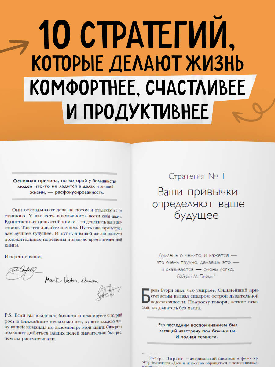 О КНИГЕ Редкий пример книги по саморазвитию, в которой нет ничего лишнего или бесполезного. Авторы подробно описывают 10 ключевых стратегий, которые не просто помогают достигать своих целей - они делают жизнь комфортнее, счастливее и продуктивнее. Стратегия №1. Формируем систему маленьких и больших привычек. Создаем каркас, который позволяет минимизировать усилия на пути к поставленной цели. Стратегия №2. Фокусируем усилия на том, что у вас получается лучше всего. Остальное делегируем. Стратегия №3. Учимся видеть картину целиком. Систематизируем свои цели, как в работе, так и в личной жизни, и вводим за правило достигать значимого результата в каждом из направлений раз в 60 дней. Стратегия №4. Сохраняем жизненный баланс по системе B-Alert. Стратегия №5. Создаем благоприятную окружающую среду. Перестаем общаться с токсичными людьми и строим взаимодействия по принципу win-win. Стратегия №6. Формируем подлинную уверенность в себе. Избавляемся от тревоги, связанной с невыполненными обязательствами, фиксируем внимание на своих достижениях. Стратегия №7. Учимся просить то, что нам нужно. Для этого сначала разбираемся со своим страхом отказов. Стратегия №8. Проявляем постоянное упорство. Фиксируем внимание на процессе, создавая привычку «делать шаг вперед каждый день». Стратегия №9. Предпринимаем решительные действия. Здесь авторы предлагают систему упражнений, которые помогают сдвинуть проекты с мертвой точки, начать двигаться вперед прямо сейчас. Стратегия №10. Начинаем жить ради цели. ОБ АВТОРАХ Книга написана тремя авторами. Самый известный из них, Джек Кэнфилд - эксперт по достижению успеха, ученик легендарного Наполеона Хилла, автор более 60 книг, переведенных на 39 языков. В том числе знаменитого «Куриного бульона для души», чей тираж в мире уже перевалил за 500 000 000 экземпляров. Ежегодный доход Кэнфилда превышает несколько миллионов долларов. Его имя занесено в Книгу рекордов Гиннесса. Остальные авторы - Марк Виктор Хансен и Лес Хьюитт - являются успешными бизнес-консультантами, коучами, предпринимателями и мотивационными ораторами. ЧИТАТЕЛИ О КНИГЕ «Если вы читаете всего одну книгу в тысячелетие, пусть это будет «Цельная жизнь» (Харви Маккей, автор книги «Как уцелеть среди акул») «Цельная жизнь» - совершенно прекрасная книга, и она непременно изменит мир на многие поколения вперед». (Кен Бланшар, соавтор книги «Одноминутный менеджер») «Действенная и очень практичная книга, которая вдохновит вас на воплощение мечты в реальность». (Доктор Барбара де Анжелис, автор книги «Подлинные моменты») «Самые успешные используют проверенные методы. «Цельная жизнь» научит вас поступать именно так». (Вик Конант, президент компании Nightingale-Conant) «Ваше умение сосредоточиться на главном - самый важный навык для достижения успеха. Эта книга поможет вам развить его во всех сферах вашей жизни. Это что-то невероятно!» (Брайан Трейси, мотивационный спикер и консультант международного уровня, автор ряда бестселлеров) «Многие люди не умеют фокусироваться на главном. Рано или поздно их ждет бедность и разочарование. Эта книга все это изменит». (Джим Рон, самый выдающийся американский бизнес-философ) «Эта книга ускорит ваш карьерный рост и одновременно привнесет много счастья и успеха в вашу личную жизнь». (Сомерс Уайт, президент компании Somers White Company, менеджер