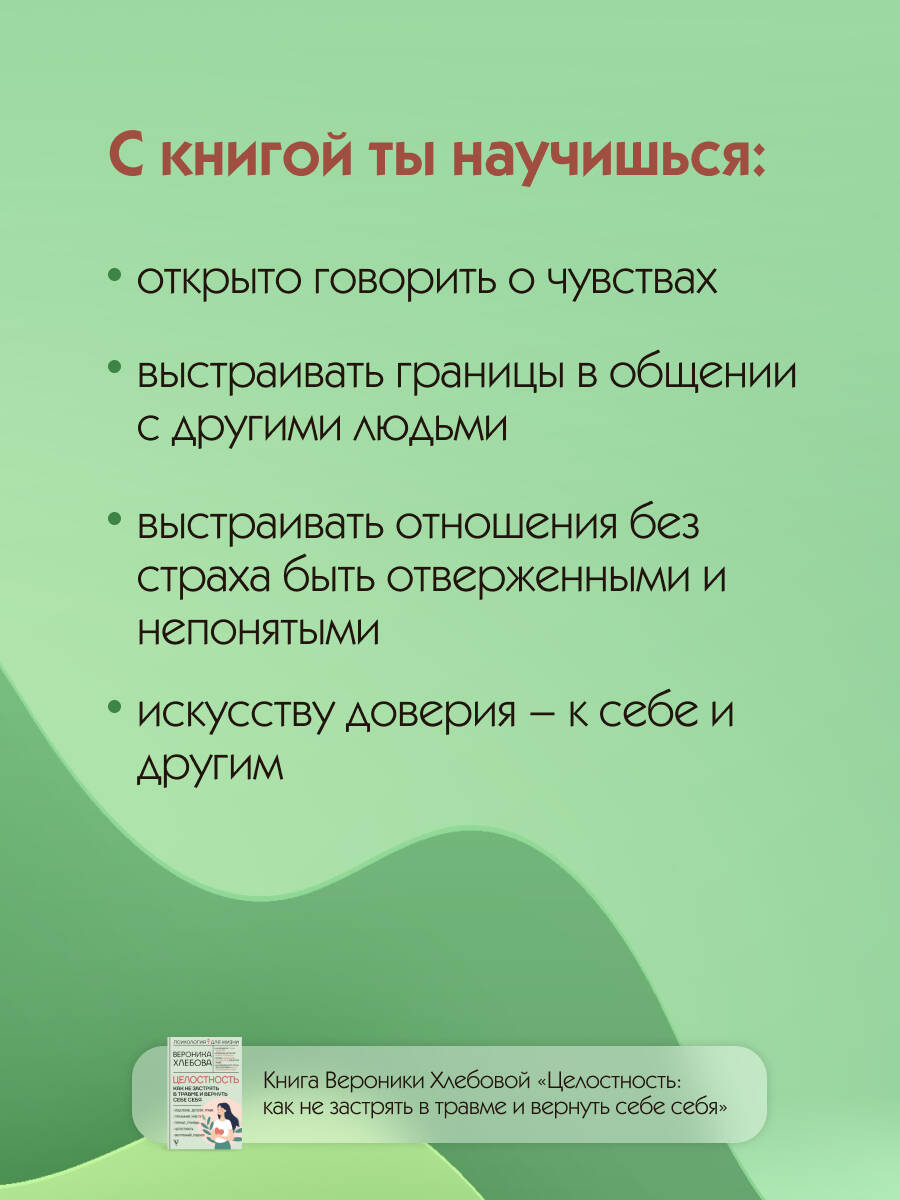 Почему нам так страшно быть самими собой? Если в отношениях с другими людьми страхи и тревога - ваши постоянные спутники, задумайтесь: чувствует ли себя в безопасности ваш Внутренний Ребенок? Эта книга поможет вам перестать сомневаться в себе, прятаться за масками и играть роли, которые вы не хотите играть. Она научит вас уважать и принимать всё, что есть внутри вас. Она подскажет, как отпустить детские чаяния, страхи и паттерны поведения, которые перенесены во взрослую жизнь из общения с самими близкими, - родителями. Психолог и автор бестселлеров о сепарации Вероника Хлебова чутко и профессионально поможет вам пройти путь исцеления от травмы недоверия. Вы сможете встать в позицию Наблюдателя и увидеть себя со стороны; найти выход из негативных сценариев; побыть наедине со своими эмоциями и лучше узнать их; сказать себе: «Я заслуживаю любви и заботы, я есть у себя, и я со всем справлюсь!»| Издательство | Издательство "АСТ" |