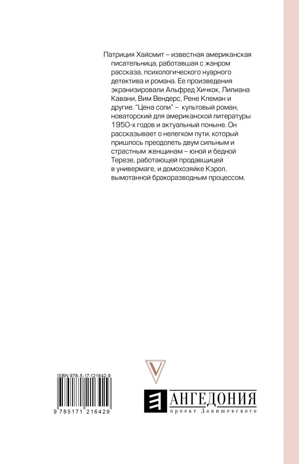 Патриция Хайсмит - известная американская писательница, работавшая с жанром рассказа, психологического нуарного детектива и романа. Ее произведения экранизировали Альфред Хичкок, Лилиана Кавани, Вим Вендерс, Рене Клеман и другие. "Цена соли" - культовый роман, новаторский для американской литературы 1950-х годов и актуальный поныне. Он рассказывает о нелегком пути, который пришлось преодолеть двум сильным и страстным женщинам - юной и бедной Терезе, работающей продавщицей в универмаге, и домохозяйке Кэрол, вымотанной бракоразводным процессом.
