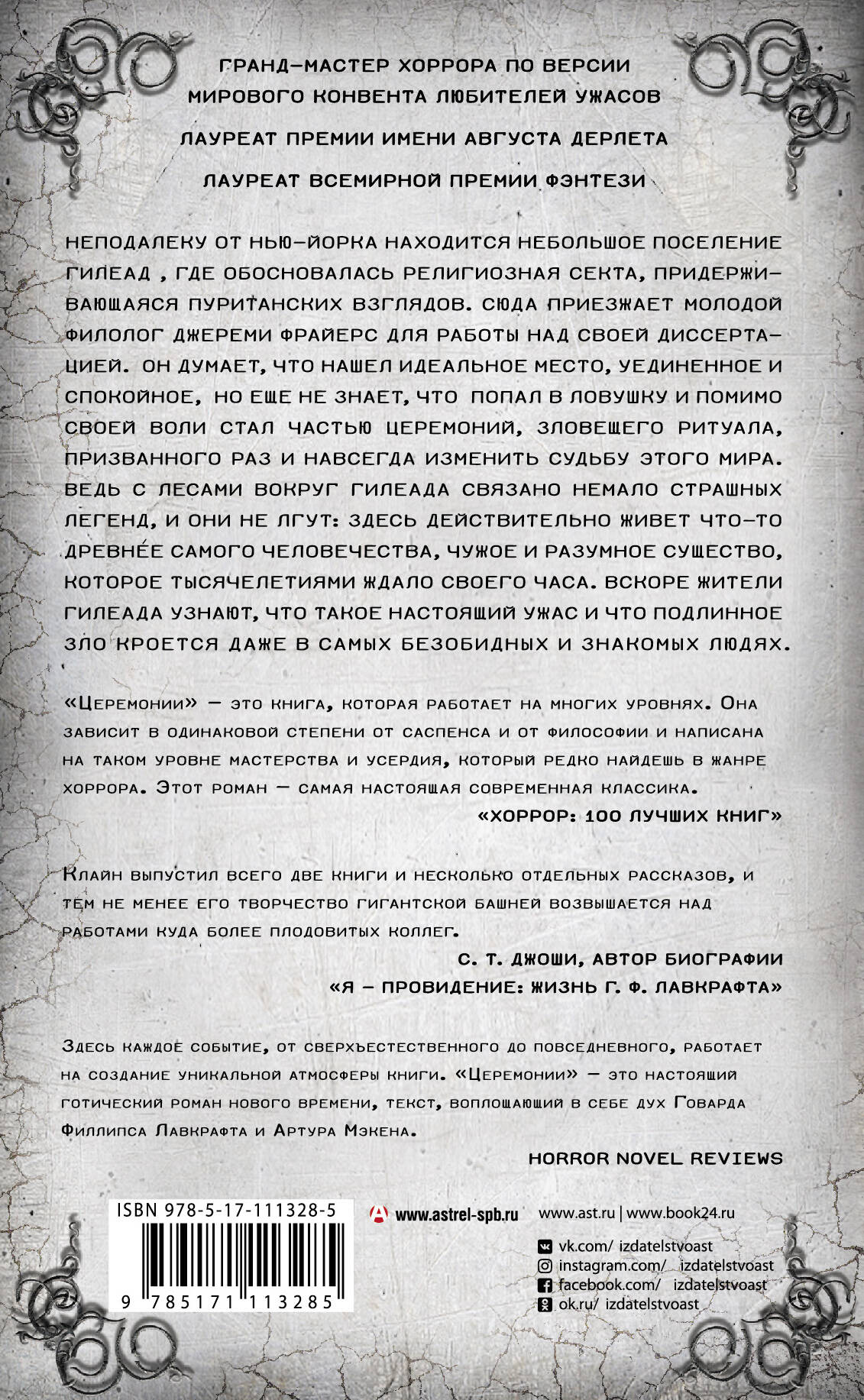 Неподалеку от Нью-Йорка находится небольшое поселение Гилеад, где обосновалась религиозная секта, придерживающаяся пуританских взглядов. Сюда приезжает молодой филолог Джереми Фрайерс для работы над своей диссертацией. Он думает, что нашел идеальное место, уединенное и спокойное, но еще не знает, что попал в ловушку и помимо своей воли стал частью Церемоний, зловещего ритуала, призванного раз и навсегда изменить судьбу этого мира. Ведь с лесами вокруг Гилеада связано немало страшных легенд, и они не лгут: здесь действительно живет что-то древнее самого человечества, чужое и разумное существо, которое тысячелетиями ждало своего часа. Вскоре жители Гилеада узнают, что такое настоящий ужас и что подлинное зло кроется даже в самых безобидных и знакомых людях.| Издательство | ИЗДАТЕЛЬСТВО "АСТ" |