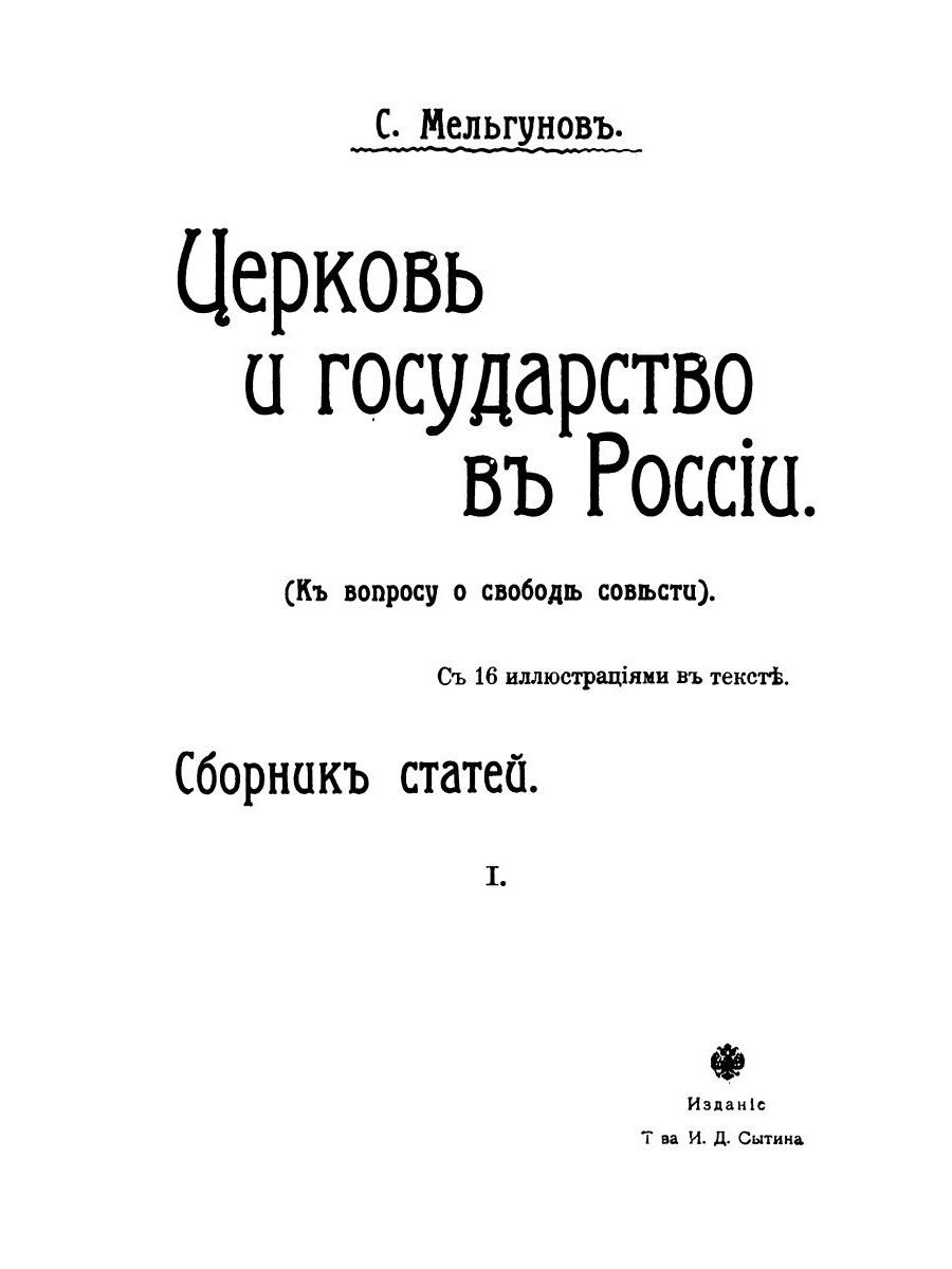 Сергей Петрович Мельгунов (1880-1956) - русский историк и политический деятель. Вначале был кадетом «Партии народной свободы», с 1907 года - энесовцем «Партии народных социалистов» и в первую очередь - участником антибольшевистской борьбы, последовавшей за Октябрьской революцией. Данный труд собран по преимуществу из газетных статей, которые посвящены отношениям церкви и государства, а также событиям, происходившим до реформы взаимоотношений одних из двух важнейших институций нашей страны. Воспроизведено в оригинальной авторской орфографии издания 1907 года (М. : Типография Т-ва И. Д. Сытина, 1907. - 194 с.).