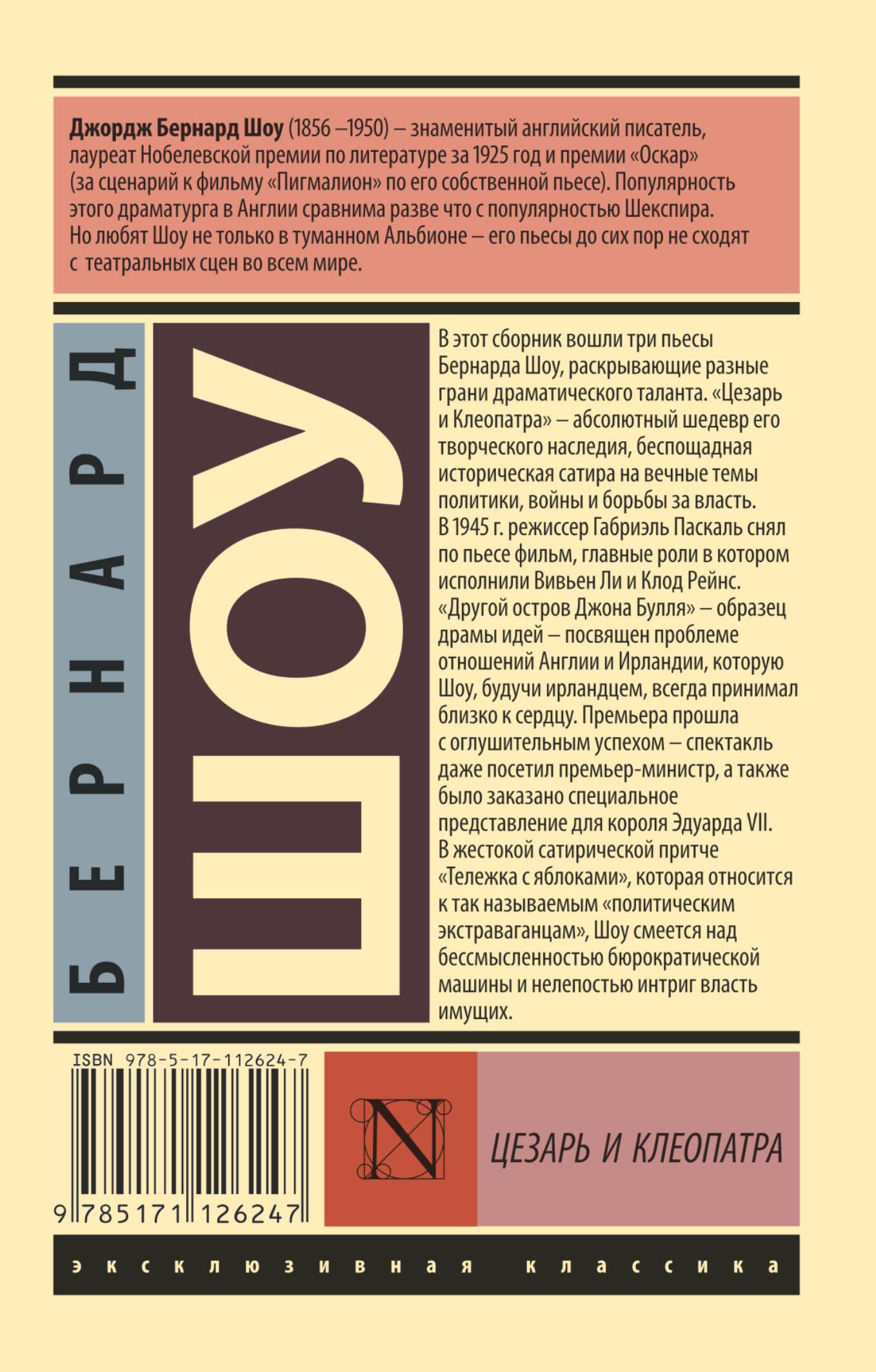 В сборник вошли три пьесы Бернарда Шоу, раскрывающие разные грани его драматургического таланта. "Цезарь и Клеопатра" - абсолютный шедевр его творческого наследия, беспощадная историческая сатира на вечные темы политики, войны и борьбы за власть. В 1945 г. режиссер Габриэль Паскаль снял по пьесе фильм, главные роли в котором исполнили Вивьен Ли и Клод Рейнс. "Другой остров Джона Булля" - образец драмы идей - посвящен проблеме отношений Англии и Ирландии, которую Шоу, будучи ирландцем, всегда принимал близко к сердцу. Премьера прошла с оглушительным успехом - спектакль даже посетил премьер-министр, а также было заказано специальное представление для короля Эдуарда VII. В жестокой сатирической притче "Тележка с яблоками", которая относится к так называемым "политическим экстраваганцам", Шоу смеется над бессмысленностью бюрократической машины и нелепостью интриг власть имущих.| Издательство | ИЗДАТЕЛЬСТВО "АСТ" |