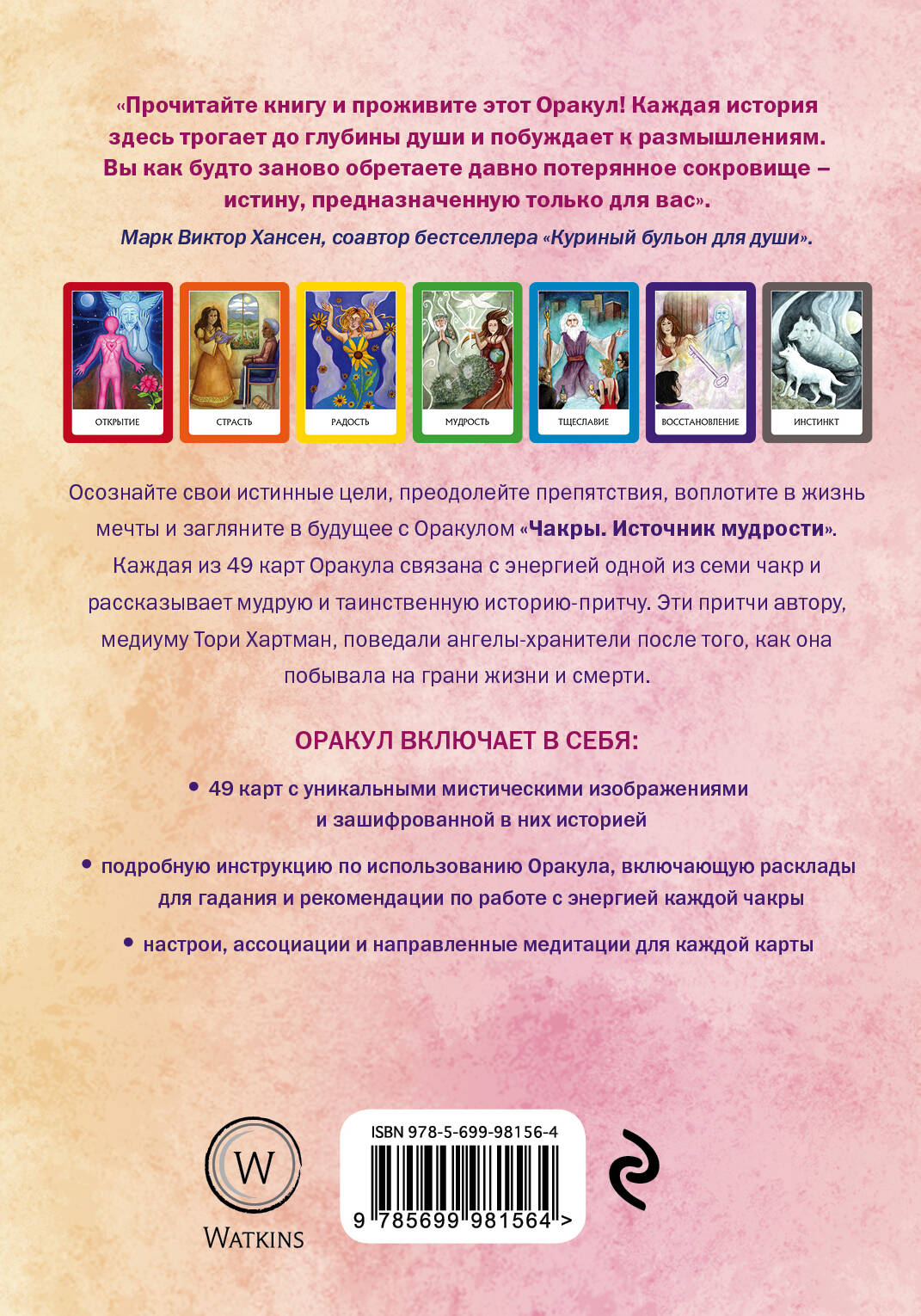 Всемирно известная колода-оракул «Чакры. Источник мудрости» в подарочном оформлении, созданная медиумом Тори Хартман, позволит вам не только заглянуть в будущее, но и познакомиться с вашим истинным «я». Карты подарят вам возможность активизировать работу семи энергетических центров - чакр - и помогут осознать тайные желания, истинные стремления и преодолеть внутренние блоки и барьеры. «Прочитайте книгу и проживите этот Оракул! Каждая история здесь трогает до глубины души и побуждает к размышлениям. Вы как будто заново обретаете давно потерянное сокровище - истину, предназначенную только для вас». Марк Виктор Хансен, соавтор бестселлера «Куриный бульон для души». Оракул «Чакры. Источник мудрости» включает в себя: • 49 карт с таинственными и трогательными изображениями, которые создала художница Гретхен Райш-Баскин, и зашифрованные в них послания-истории • Цветную книгу-инструкцию по использованию Оракула, включающую расклады для гадания и рекомендации по работе с каждой картой и энергией чакр • настрои, ассоциации и направленные медитации для всех карт колоды Тори Хартман - всемирно известный духовный учитель и экстрасенс. Ее кредо - «Просветление - это просто» - говорит о ее желании всецело поддержать людей, ищущих свой собственный духовный путь. Свои экстрасенсорные способности она впервые осознала, когда ей было восемь лет. Ее встречи с ангелами начались 25 лет назад, после пережитого околосмертного опыта; в результате этого общения на свет появились знаменитые притчи, которые и послужили основой для Оракула.| Издательство | Эксмо |