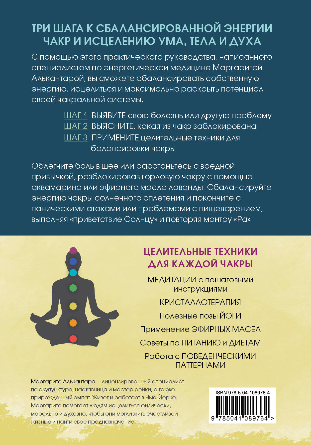 С помощью этого практического руководства, написанного специалистом по энергетической медицине Маргаритой Алькантарой, вы сможете гармонизировать собственную энергию, исцелиться и максимально раскрыть потенциал своей чакральной системы. Эта книга расскажет, как сделать три шага к сбалансированной энергии чакр и исцелению ума, тела и духа. ШАГ 1. Выявите свою болезнь или другую проблему. ШАГ 2. Выясните, какая из чакр заблокирована. ШАГ 3. Примените целительные техники для балансировки чакры. Облегчите боль в шее или расстаньтесь с вредной привычкой, разблокировав горловую чакру с помощью аквамарина или эфирного масла лаванды. Сбалансируйте энергию чакры солнечного сплетения и покончите с паническими атаками или проблемами с пищеварением, выполняя «приветствие Солнцу» и повторяя мантру «Ра». В этой книге вы найдете целительные техники для каждой чакры, доступные даже тем, кто никогда прежде не работал с энергиями: • медитации с пошаговыми инструкциями; • техники работы с кристаллами; • полезные позы йоги с наглядными схемами; • применение эфирных масел; • советы по питанию и диетам; • работа с поведенческими паттернами. Маргарита Алькантара - лицензированный специалист по акупунктуре, наставница и мастер рэйки, а также прирожденный эмпат. Живет и работает в Нью-Йорке. Маргарита помогает людям исцелиться физически, морально и духовно, чтобы они могли жить счастливой жизнью и найти свое предназначение.| Издательство | ООО "Издательство "Эксмо" |