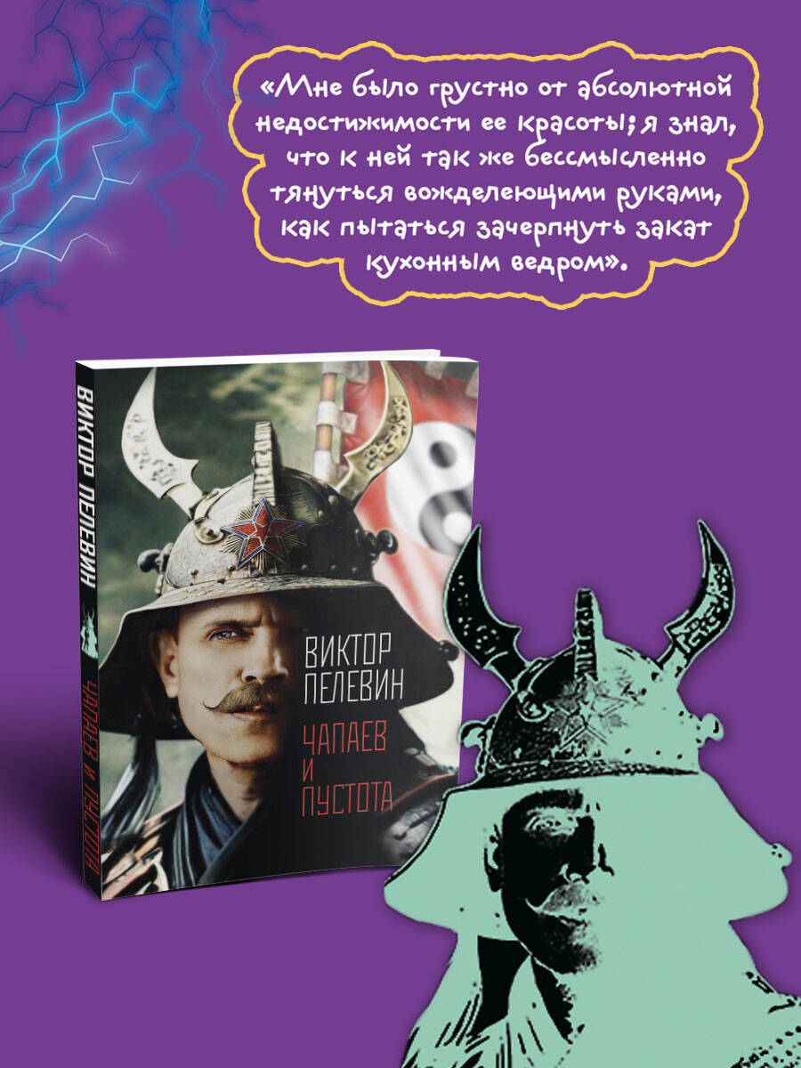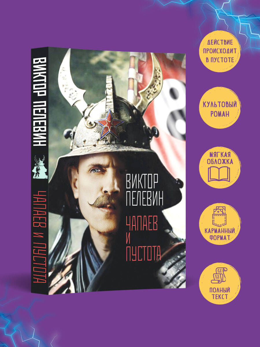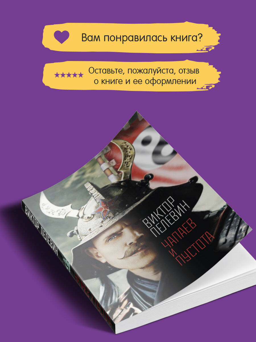Роман «Чапаев и Пустота» сам автор характеризует так: «Это первое произведение в мировой литературе, действие которого происходит в абсолютной пустоте». На самом деле оно происходит в 1919 году в дивизии Чапаева, в которой главный герой, поэт-декадент Петр Пустота, служит комиссаром. А также в наши дни. А также, как и всегда у Пелевина, в виртуальном пространстве, где с главным героем встречаются Кавабата, Шварценеггер, «просто Мария»… По мнению критиков, «Чапаев и Пустота» является «первым серьезным дзен-буддистским романом в русской литературе».| Издательство | ООО "Издательство "Эксмо" |