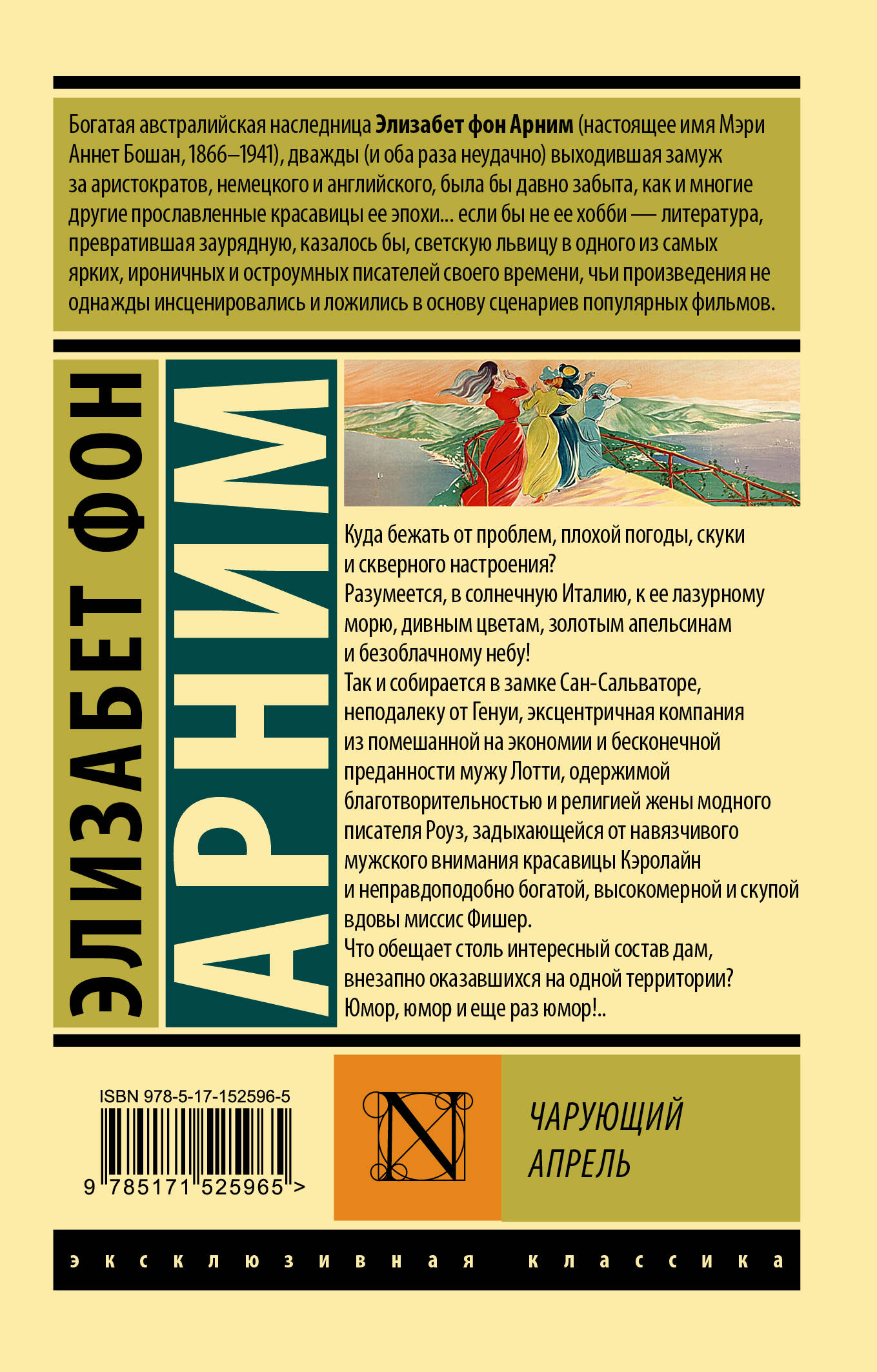 Куда бежать от проблем, плохой погоды, скуки и скверного настроения? Разумеется, в солнечную Италию, к ее лазурному морю, дивным цветам, золотым апельсинам и безоблачному небу! Так и собирается в замке Сан-Сальваторе, неподалеку от Генуи, эксцентричная компания из помешанной на экономии и бесконечной преданности мужу Лотти, одержимой благотворительностью и религией жены модного писателя Роуз, задыхающейся от навязчивого мужского внимания красавицы Кэролайн и неправдоподобно богатой, высокомерной и скупой вдовы миссис Фишер. Что обещает столь интересный состав дам, внезапно оказавшихся на одной территории? Юмор, юмор и еще раз юмор!..| Издательство | ИЗДАТЕЛЬСТВО "АСТ" |