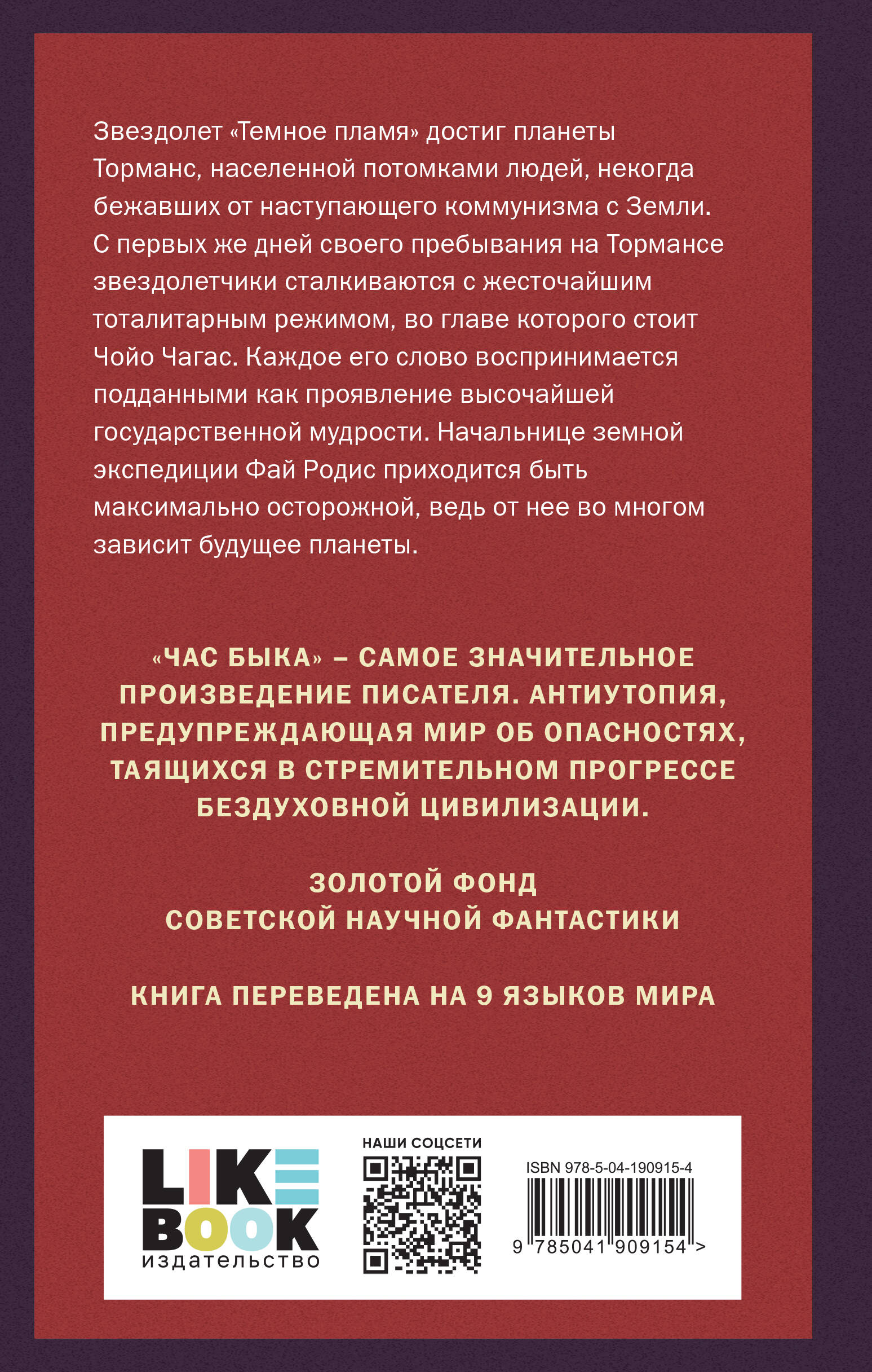 «Час Быка» - самое значительное произведение Ивана Ефремова. Антиутопия, предупреждающая мир об опасностях, таящихся в стремительном прогрессе бездуховной цивилизации. Звездолет «Темное пламя» достиг планеты Торманс, населенной потомками людей, некогда бежавших от наступающего коммунизма с Земли. С первых же дней своего пребывания на Тормансе звездолетчики сталкиваются с жесточайшим тоталитарным режимом, во главе которого стоит Чойо Чагас. Каждое его слово воспринимается его подданными как проявление высочайшей государственной мудрости. Начальнице земной экспедиции, историку Фай Родис, приходится быть максимально осторожной, ведь от нее во многом зависит будущее планеты. «Золотой фонд» советской научной фантастики. Книга переведена на 9 языков мира. «Иван Ефремов: настоящий сверхчеловек из светлого будущего». - Мир фантастики| Издательство | ООО "Издательство "Эксмо" |