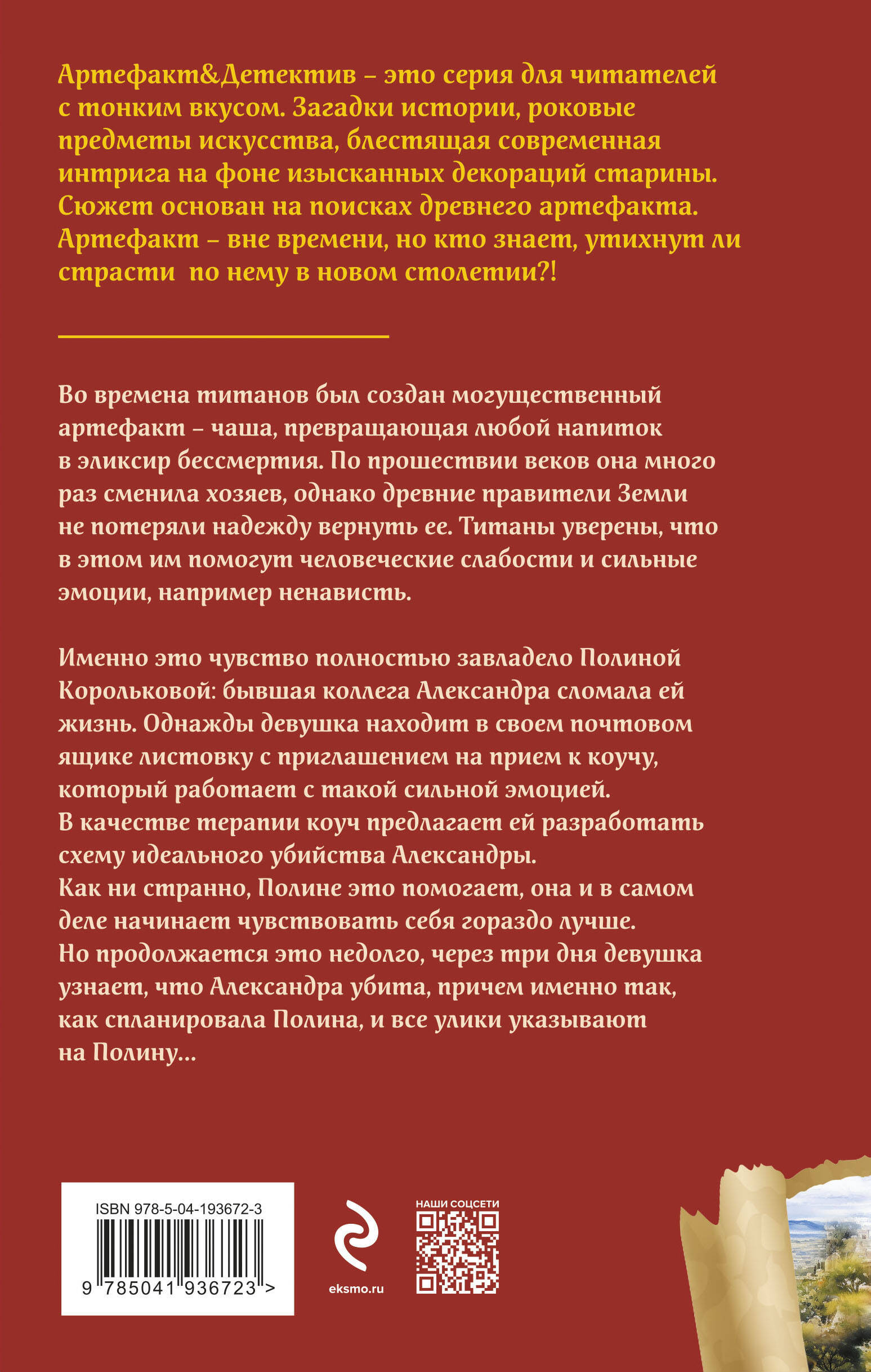 Во времена титанов был создан могущественный артефакт - чаша, превращающая любой напиток в эликсир бессмертия. По прошествии веков она много раз сменила хозяев, однако древние правители Земли не потеряли надежду вернуть ее. Титаны уверены, что в этом им помогут человеческие слабости и сильные эмоции, например, ненависть. Именно это чувство полностью завладело Полиной Корольковой: бывшая коллега Александра сломала ей жизнь. Однажды девушка находит в своем почтовом ящике листовку с приглашением на прием к коучу, который работает с такой сильной эмоцией. В качестве терапии коуч предлагает ей разработать схему идеального убийства Александры. Как ни странно, Полине это помогает, она и в самом деле начинает чувствовать себя гораздо лучше. Но продолжается это недолго, через три дня девушка узнает, что Александра убита, причем именно так, как спланировала Полина, и все улики указывают на Полину…| Издательство | ООО "Издательство "Эксмо" |