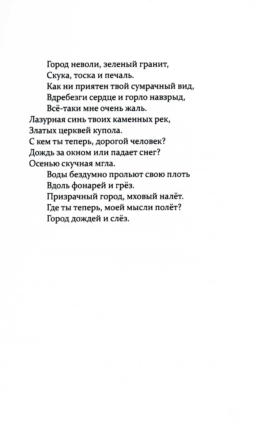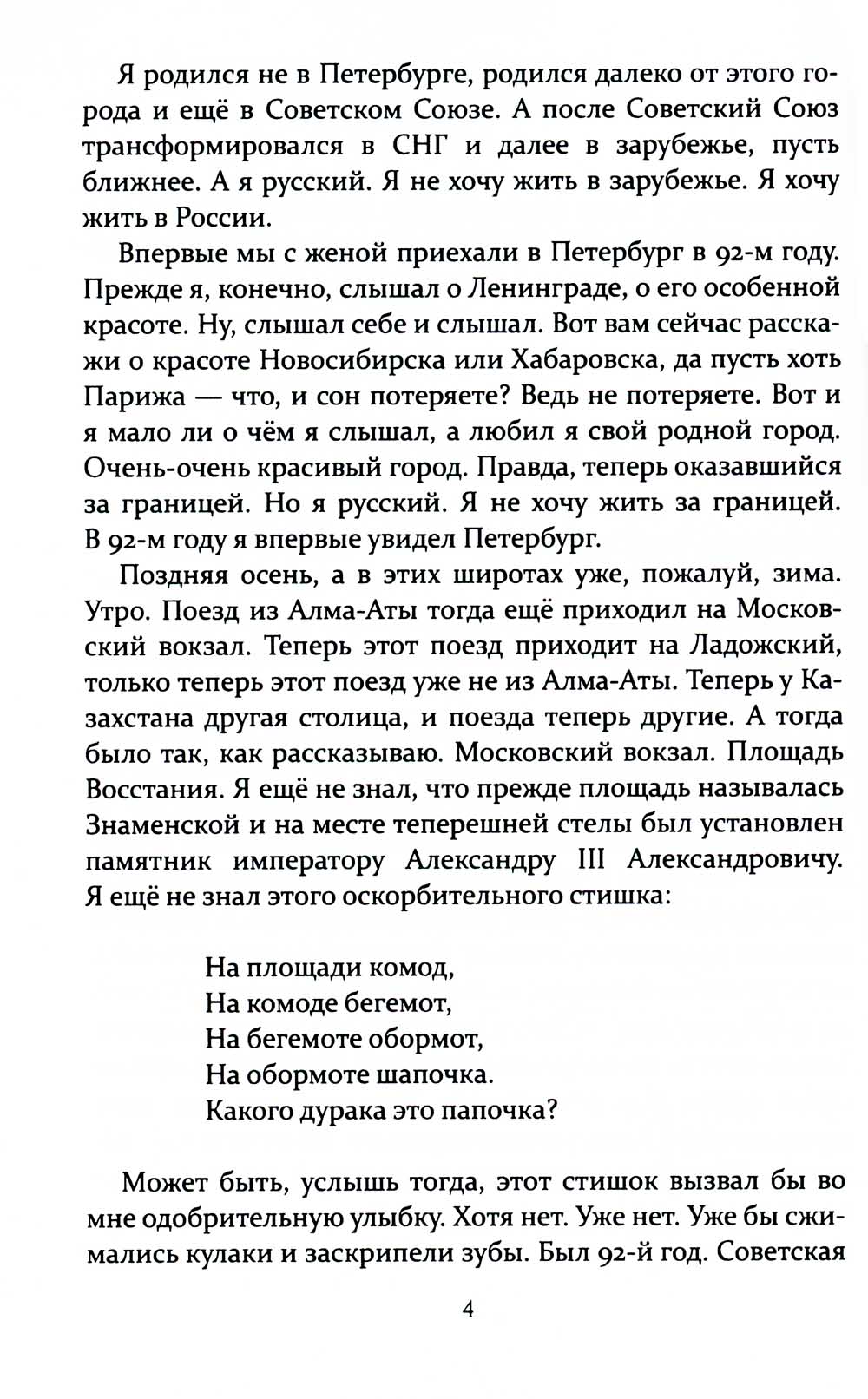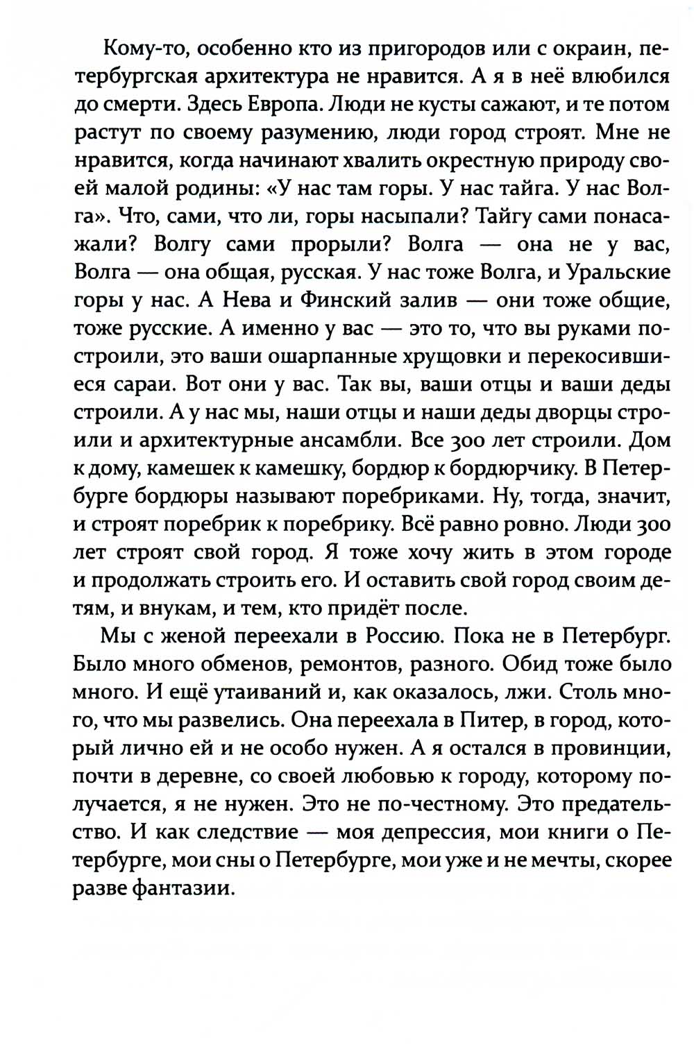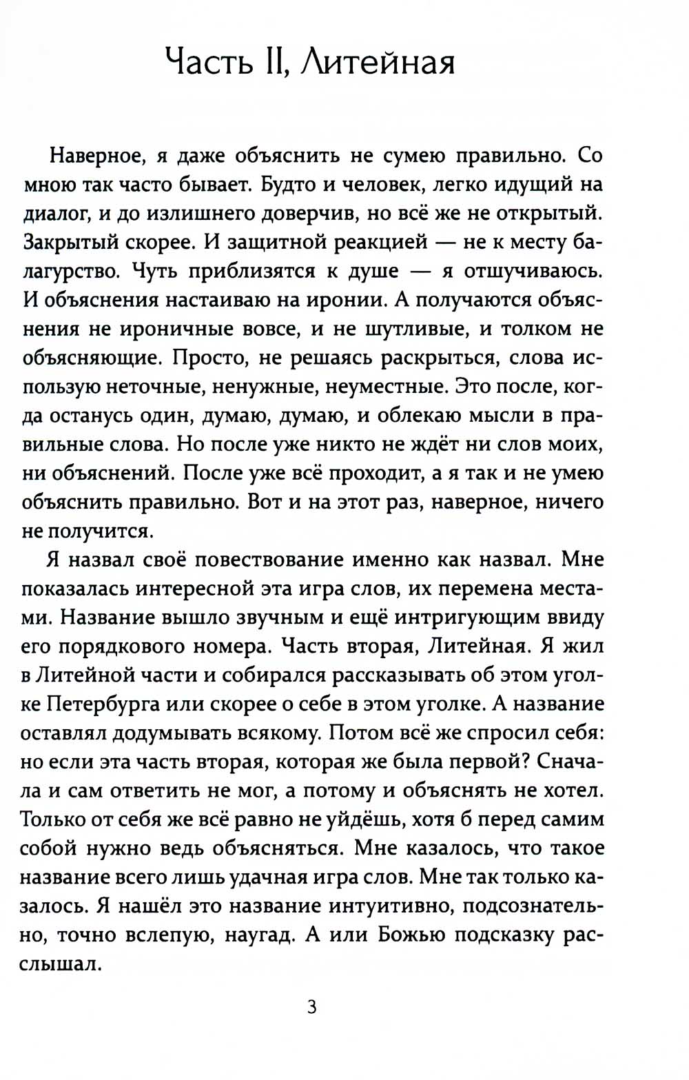 В пасмурную погоду невская вода принимает цвет отражаемых туч, землистый и стальной. А как выдастся погожий денёк - и небо кругом голубое, и Нева синяя-синяя. Если вы прогуливаетесь погожим днём, вы обязательно залюбуетесь этой божественной синевой. Здесь вообще писательский уголок. Может даже и весь город писательский. Его центральная, историческая часть, по крайней мере. Лучшие представители русской литературы или родились, или жили и работали в Петербурге. Пушкин, Жуковский, Баратынский, Достоевский, Куприн, Бунин, Ахматова, Мандельштам, Бродский, много, много других. Тогда, пожалуй, и свой рассказ я поведу, прогуливаясь по писательской Литейной части, улица за улицей, дом за домом. Дефилируя по Литейной части. Сейчас бы сказали, бесцельно слоняясь, праздно шатаясь, ну или гуляя, прогуливаясь. А во времена империи дефилировали. Теперь нет Империи, теперь праздно слоняются, уже не дефилируют. В том числе и потому в свои прогулки я не беру никого. Я всегда один, и со мною только Петербург с его обитателями, особенно теми, которые давно ушли в иной мир. "Часть II, Литейная". Моховая. Хамовая. Хамовники. Давно ушедшая эпоха. Выцветшие фотографии. Забытые имена. Истёршиеся судьбы. Мытарь, вратарь, просол, скорняк, гончар, бондарь. Право же и не тотчас сообразили, о каких ремёслах говорю. Русь уходящая. Даже, пожалуй, уже ушедшая. Навсегда. Как насмерть. Я благодарен судьбе за то, что живу в этом городе, в его историческом центре. Я не стал счастливым в Петербурге, но без этого города был бы несчастным. Быть не счастливым и быть несчастным - это всё ж не одно и то же, это разные степени депрессии.
