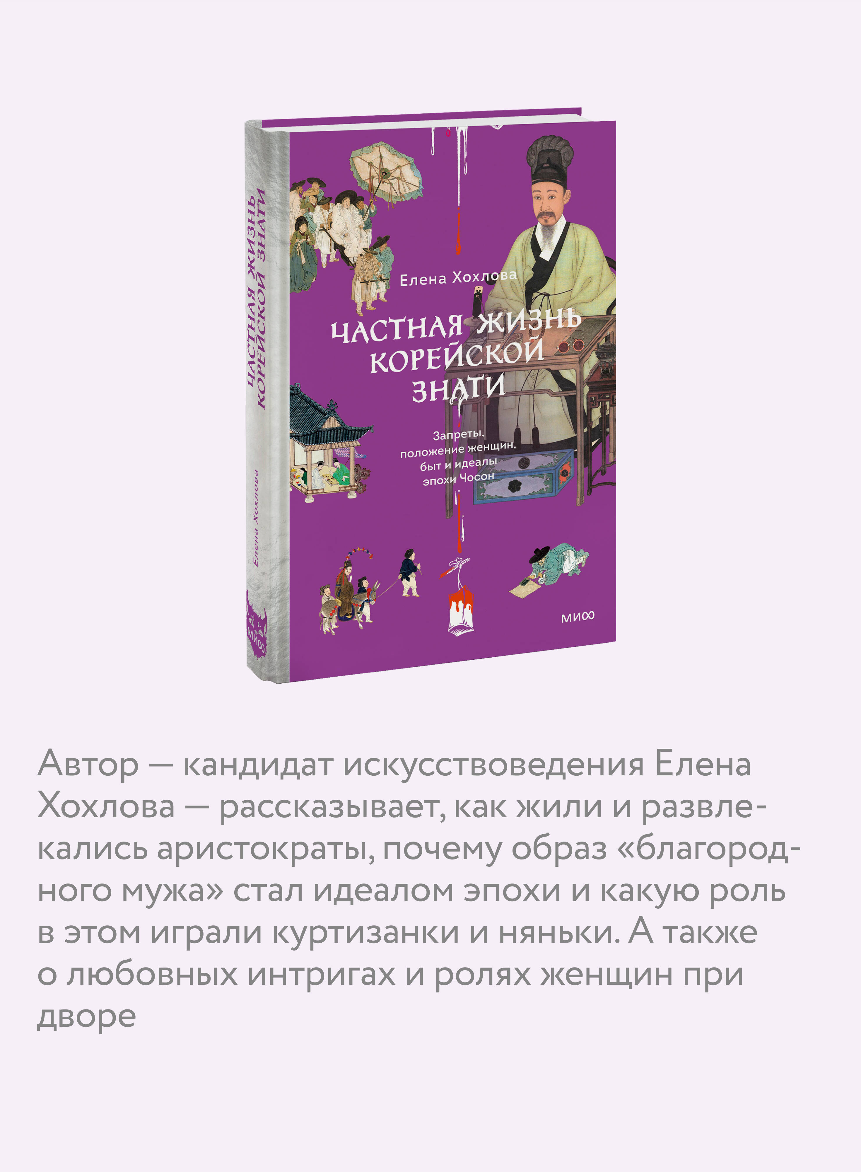 Что скрывалось за расписными ширмами, шелковыми халатами и безупречными поклонами эпохи Чосон (1392-1897)? В этой книге вас ждет увлекательное путешествие в частную жизнь корейской знати. Автор рассказывает, как жили и развлекались аристократы, почему образ "благородного мужа" стал идеалом эпохи, и какую роль в этом играли куртизанки, няньки и даже собаки с петухами. А также о ролях женщин при дворе, любовных интригах и семейных трагедиях.| Издательство | МИФ ООО |